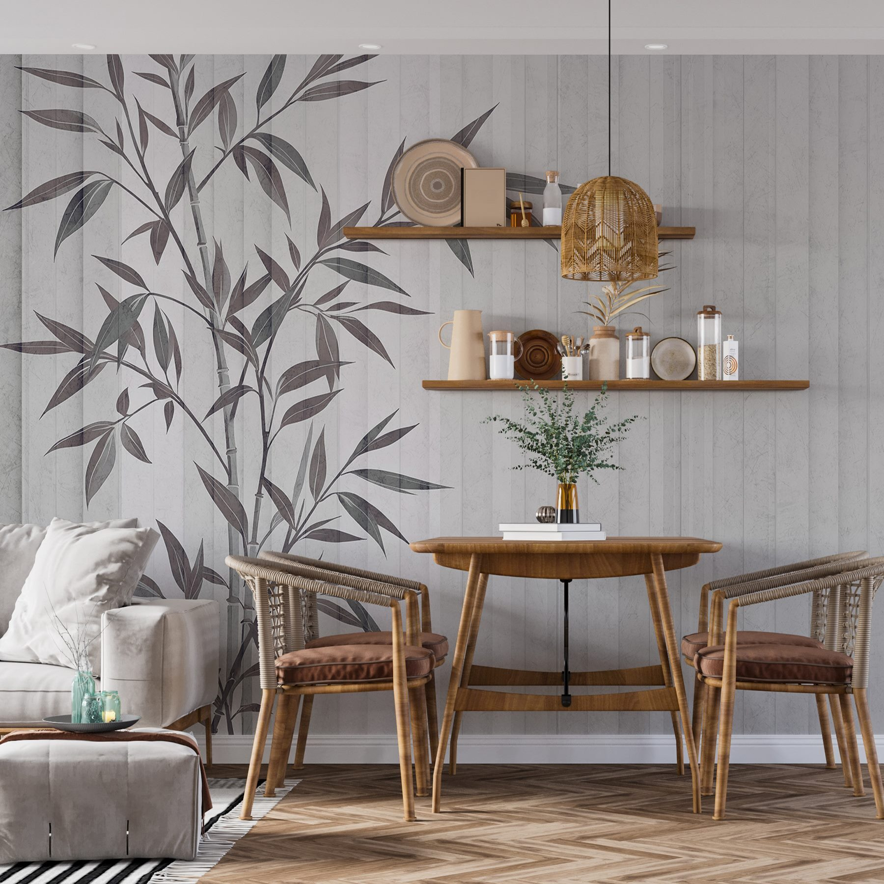 Transforme o seu espaço com este encantador mural de parede que apresenta um delicado desenho de plantas sobre um fundo suave e às riscas. É como trazer uma fatia da natureza para dentro de casa, sem os insectos incómodos. Imagine-se a beber café da manhã ou a enrolar-se com um bom livro, rodeado por esta vibração calmante. Os tons suaves e as folhas elegantes criam uma atmosfera calorosa e convidativa, perfeita para qualquer divisão. É quase como ter uma parede de jardim tranquila – sem a necessidade de ter um polegar verde. Perfeito para quem quer um toque de natureza sem o compromisso.