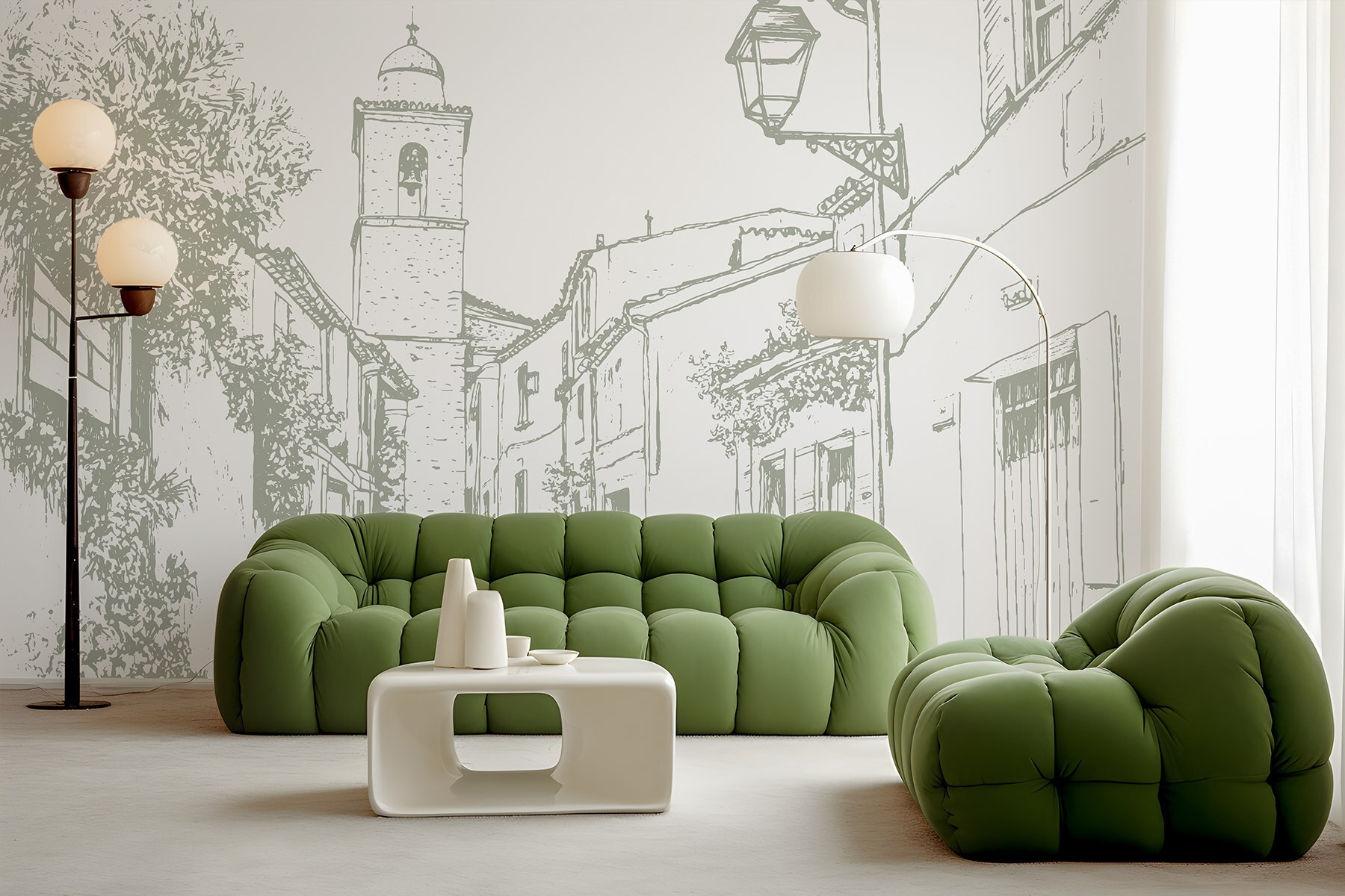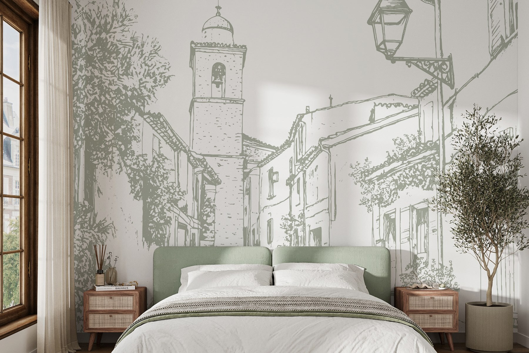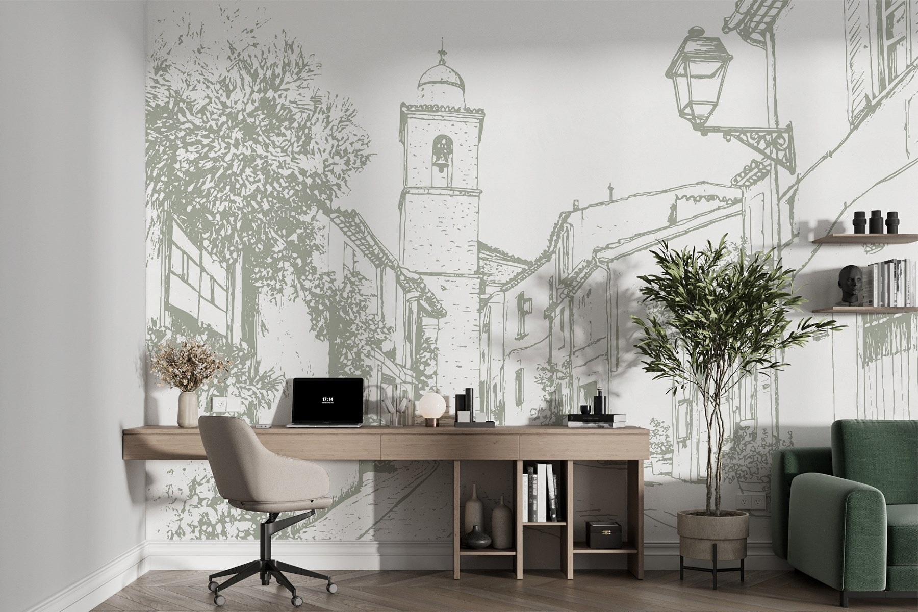 Transforme o seu espaço com este encantador mural de parede, um esboço encantador de uma rua pitoresca com uma bela torre sineira. É como entrar numa aldeia serena sempre que passa por ela. Imagine-se a beber café num recanto acolhedor, com as suas paredes cheias de vibrações pacíficas. Os contornos suaves dos edifícios e a vegetação luxuriante trazem uma sensação de calma, perfeita para descontrair após um longo dia. Este mural prepara o cenário para devaneios de viagens e aventuras. Deixe-o inspirar histórias e trazer calor a qualquer divisão – porque quem não quer uma pitada de capricho na sua vida?
