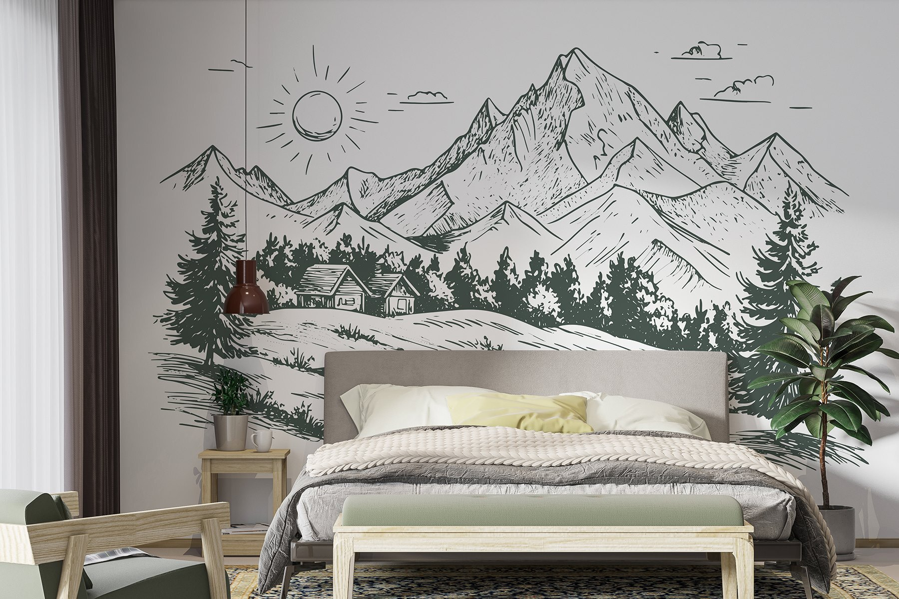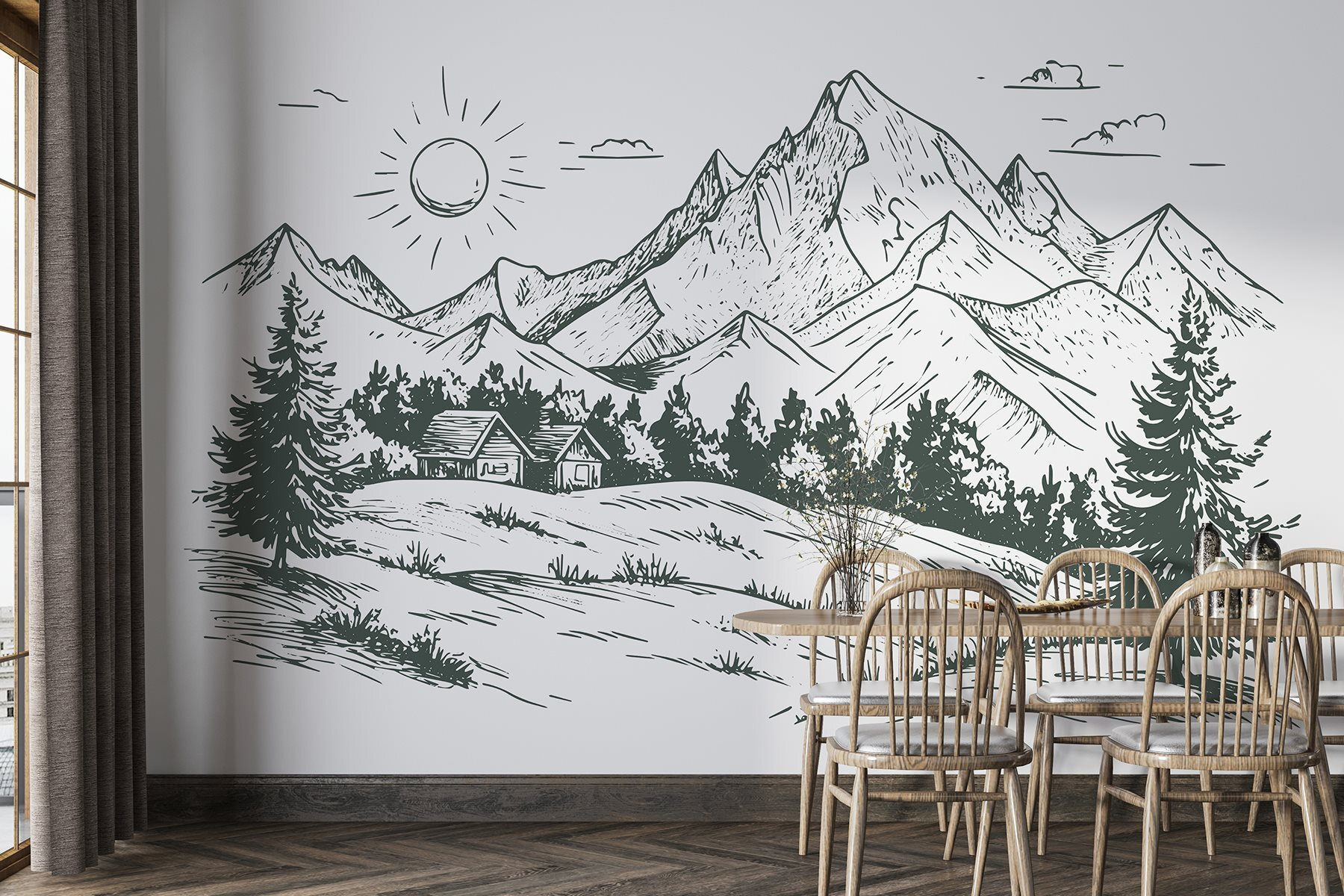 Transforme uma parede em branco numa fuga serena com este mural cativante que apresenta uma casa encantadora aninhada entre grandes montanhas e árvores exuberantes. Imagine acordar com uma suave lembrança da beleza da natureza, mesmo na sua sala de estar ou escritório em casa. As linhas nítidas e os tons de terra criam uma vibração tranquila, perfeita para descontrair após um longo dia. É como trazer um pouco do ar livre para dentro de casa, sem os mosquitos. Quer se trate de um recanto de leitura acolhedor ou de um espaço convidativo para os amigos, este mural define o ambiente. Quem não gostaria de se sentir um pouco mais zen no seu dia a dia?