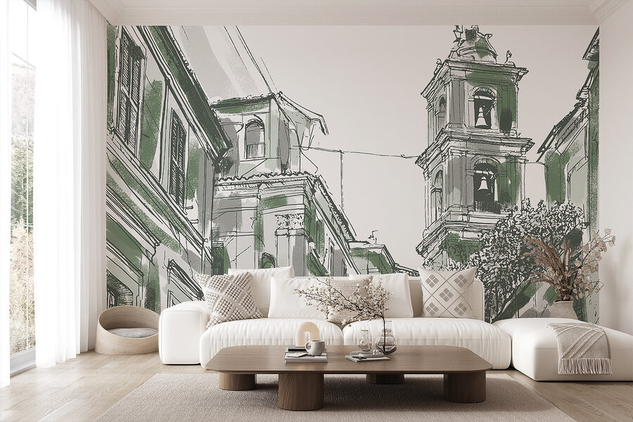 Dê um toque de charme urbano ao seu espaço com este mural de parede encantador. Imagine: um desenho cativante de um edifício adornado com sinos, sussurrando histórias de uma vida citadina agitada. Os verdes suaves e as linhas intrincadas convidam-no a espreitar para uma paisagem de rua serena mas animada, despertando a imaginação. Imagine-se a beber um café, a olhar para este mural e a sentir o calor da comunidade e da história à sua volta. Perfeito para salas de estar, cafés ou recantos de leitura acolhedores, acrescenta personalidade sem sobrecarregar o espaço. É como ter um pequeno pedaço da magia da cidade mesmo em casa.