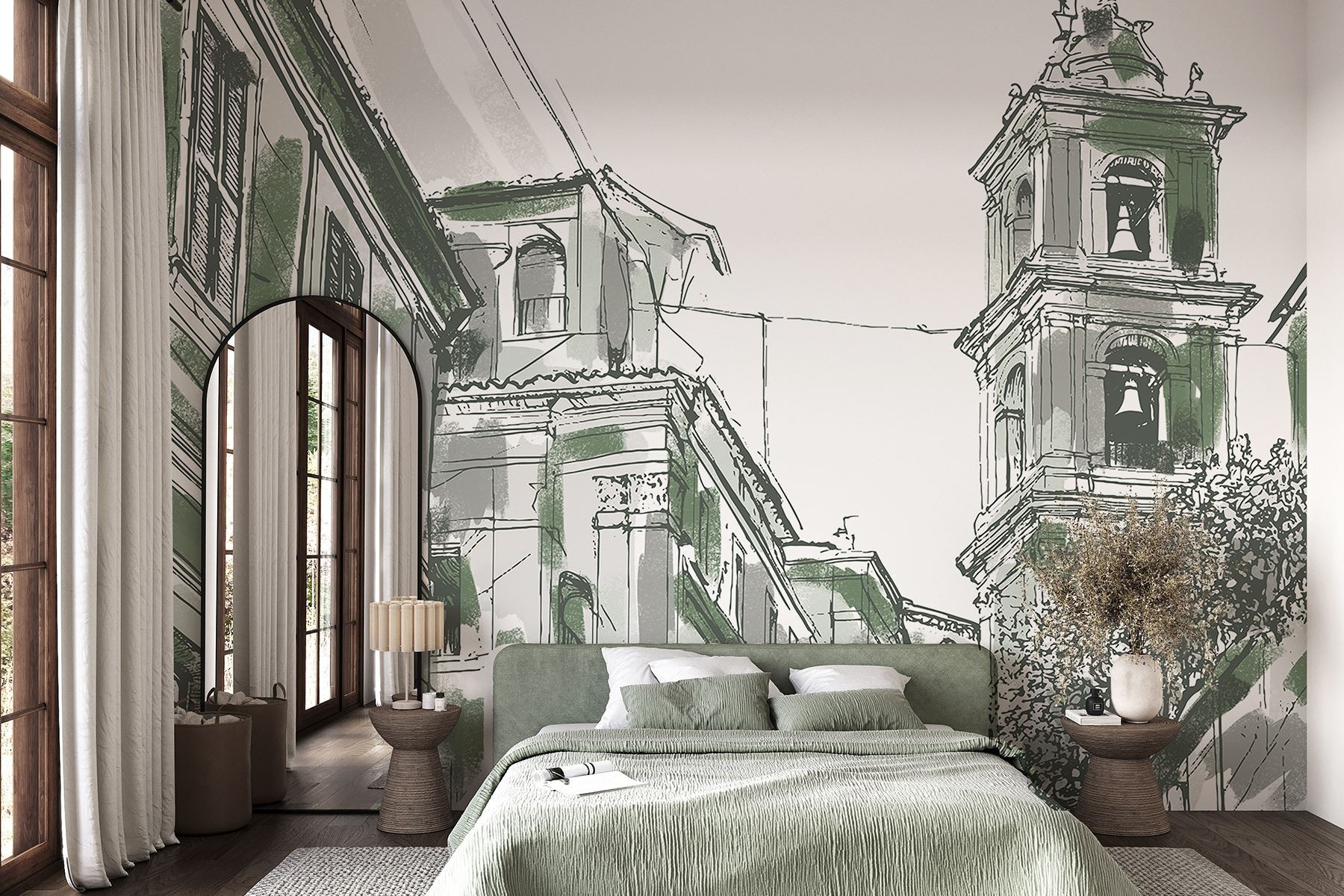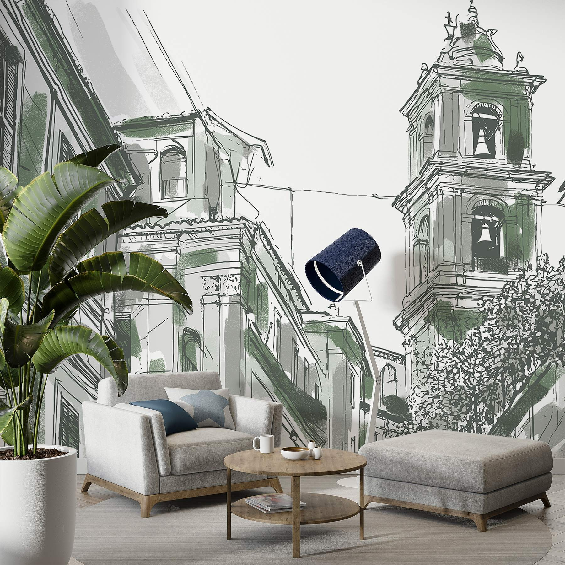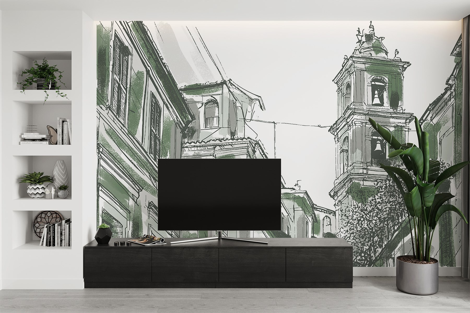 Dê um toque de charme urbano ao seu espaço com este mural de parede encantador. Imagine: um desenho cativante de um edifício adornado com sinos, sussurrando histórias de uma vida citadina agitada. Os verdes suaves e as linhas intrincadas convidam-no a espreitar para uma paisagem de rua serena mas animada, despertando a imaginação. Imagine-se a beber um café, a olhar para este mural e a sentir o calor da comunidade e da história à sua volta. Perfeito para salas de estar, cafés ou recantos de leitura acolhedores, acrescenta personalidade sem sobrecarregar o espaço. É como ter um pequeno pedaço da magia da cidade mesmo em casa.