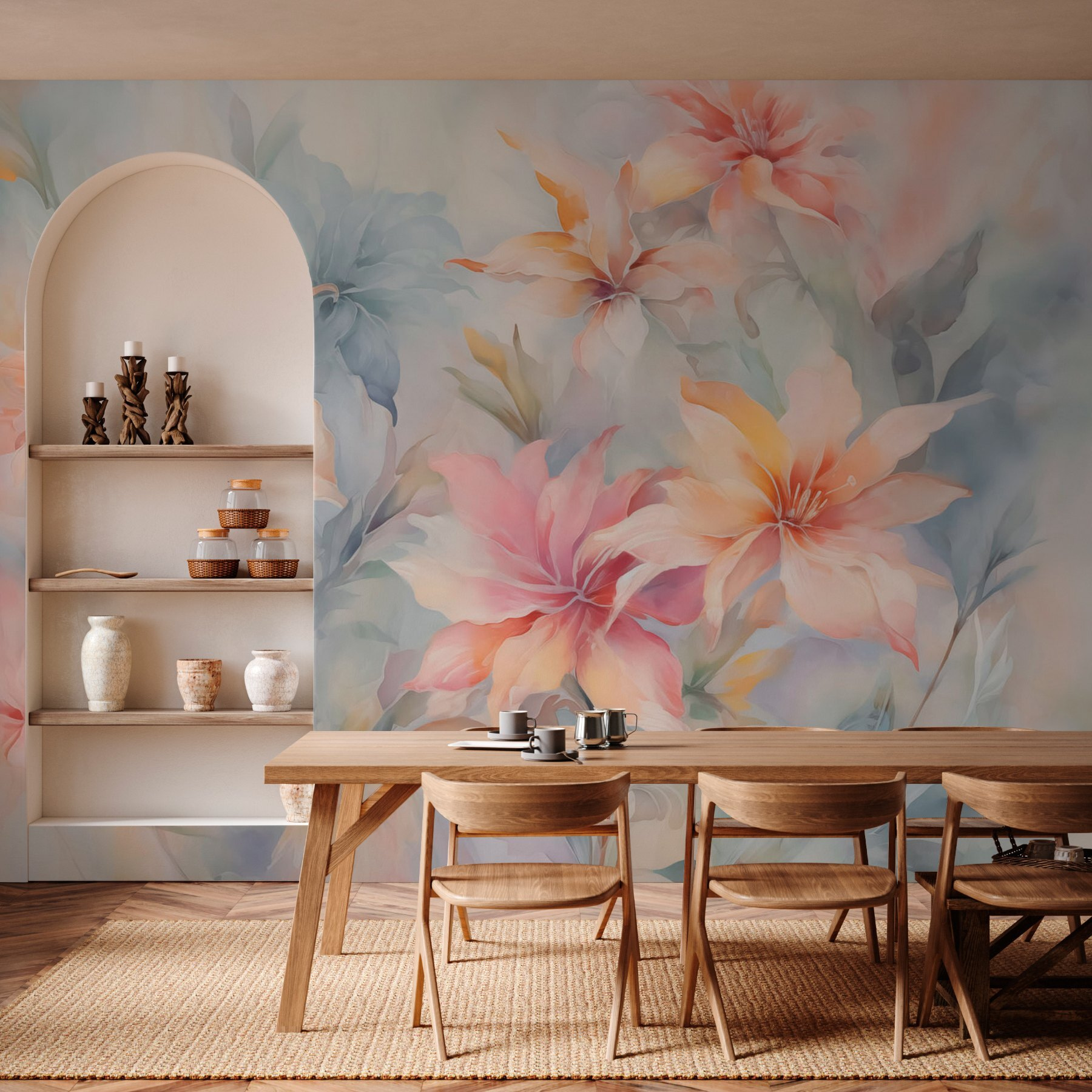 Transforme qualquer espaço com este deslumbrante mural de parede com um delicioso ramo de flores. É como trazer um jardim para sua casa sem se preocupar com a rega! O estilo suave da aguarela rodopia em tons suaves, criando uma atmosfera calma e convidativa, perfeita para um recanto acolhedor ou uma sala de estar animada. Imagine-se a beber chá enquanto desfruta da beleza – quem não se sentiria inspirado? Além disso, também é um ótimo início de conversa. Os amigos não vão apenas ver flores; vão sentir-se como se estivessem a entrar num sonho de sonho. A natureza está na ponta dos seus dedos!