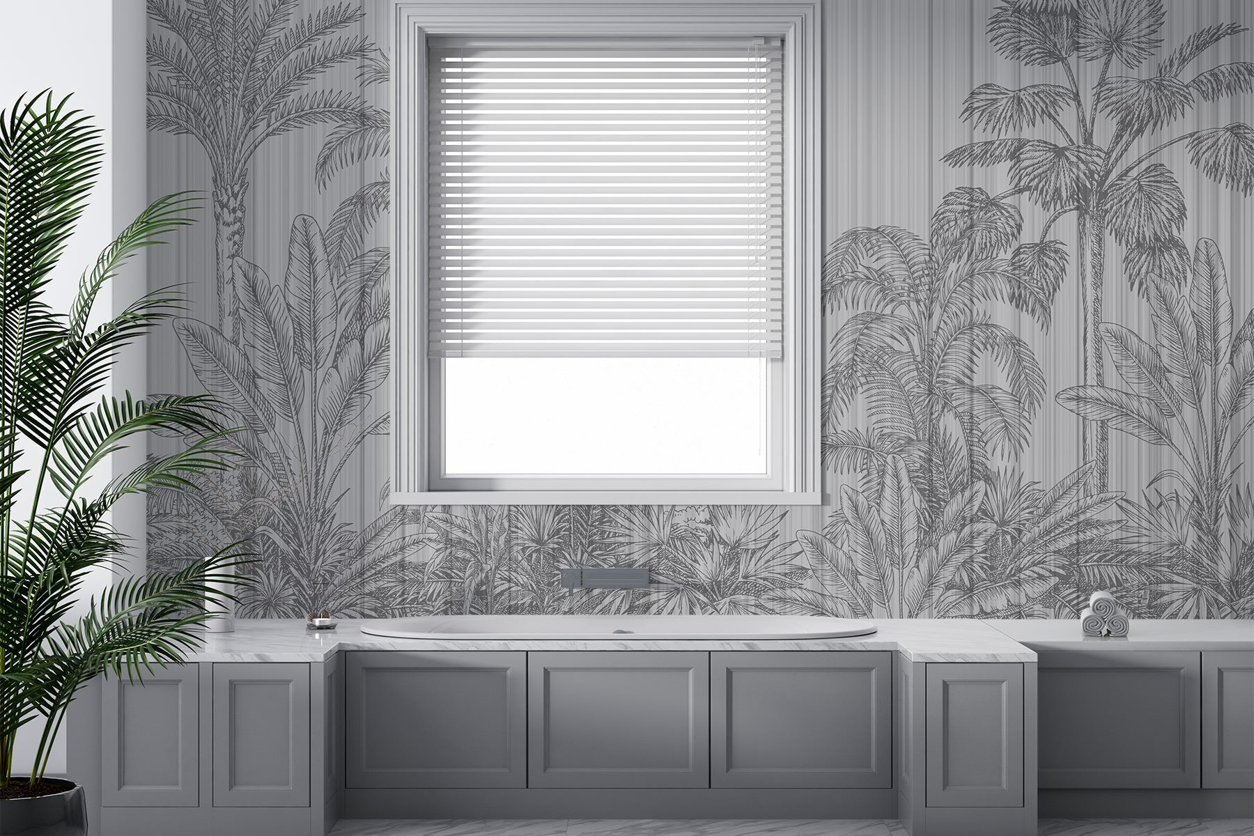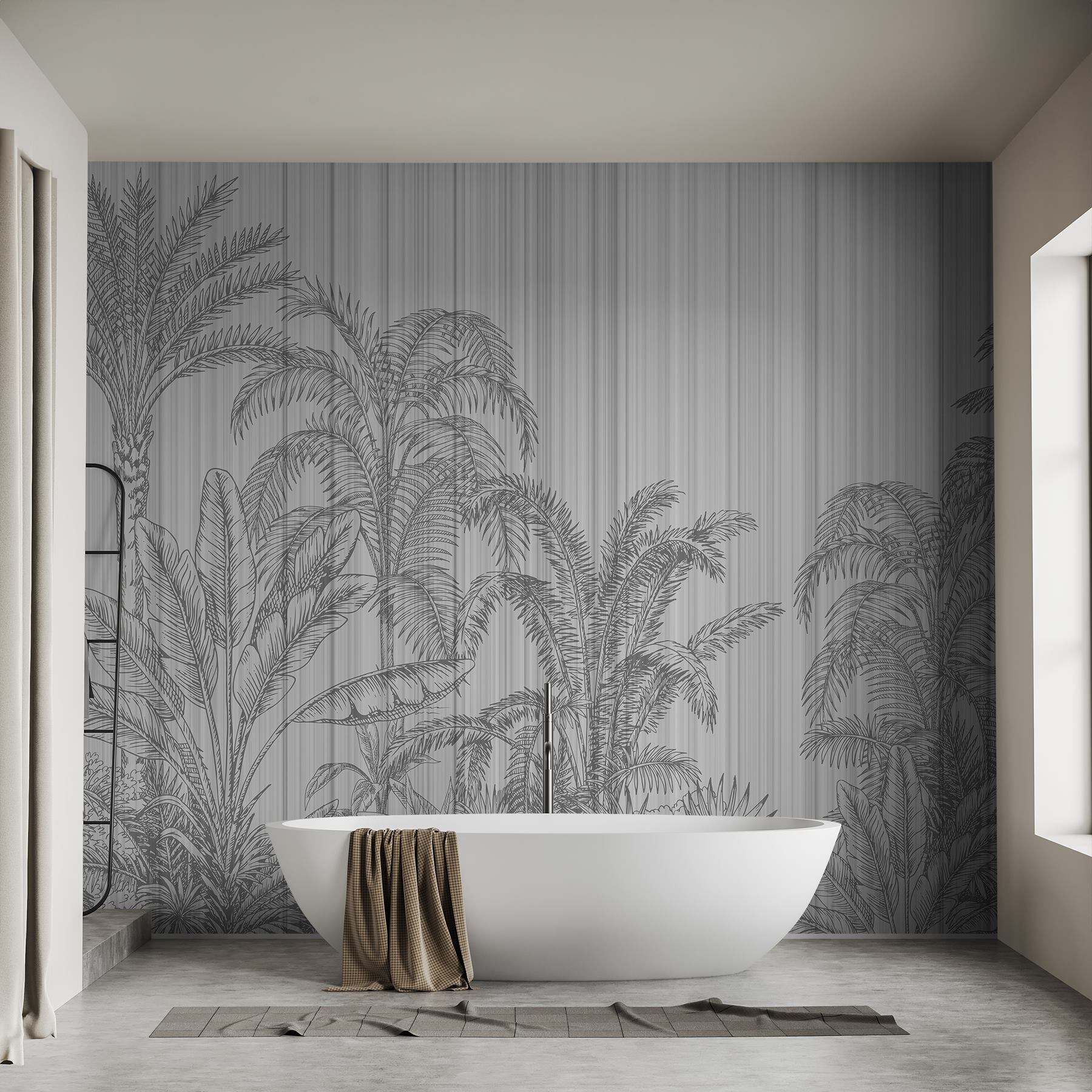 Transforme o seu espaço com este deslumbrante mural de parede que sussurra “oásis tropical” sem necessidade de protetor solar. O pano de fundo cinzento e branco com palmeiras acrescenta um toque de sofisticação calma. Imagine entrar no seu quarto e sentir-se imediatamente como se estivesse numa serena escapadela numa ilha.
