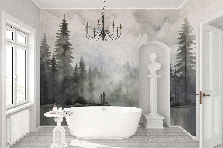 Transforme qualquer espaço com este deslumbrante mural de aguarela de uma floresta e um lago sereno. Imagine entrar numa divisão e sentir-se como se tivesse entrado no abraço da natureza. Os tons suaves de cinzento e verde oferecem uma vibração calmante, perfeita para criar um retiro tranquilo em sua casa.