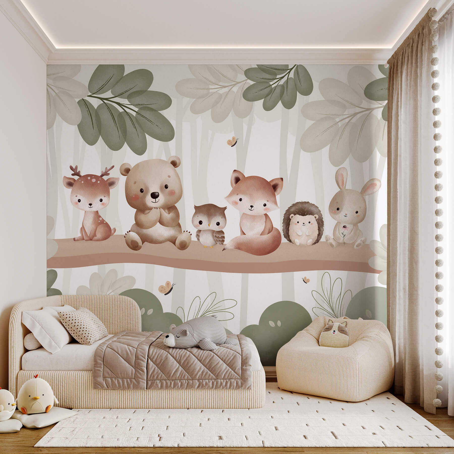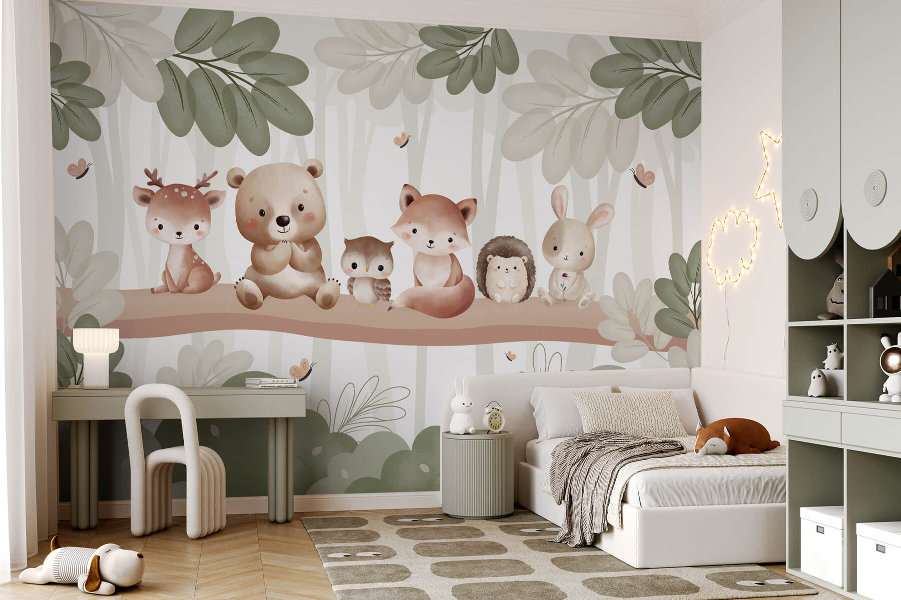 Imagine um recanto acolhedor repleto do encanto de um país das maravilhas da floresta. Este mural encantador apresenta um grupo adorável de amigos animais empoleirados num ramo, prontos para dar um toque de capricho a qualquer espaço. Imagine um veado tímido, um urso curioso e uma raposa brincalhona, todos aninhados entre folhas verdes. É o cenário perfeito para o quarto de uma criança, provocando histórias sobre aventuras na floresta mágica. Cada olhar convida ao riso e à imaginação, criando um calor que o envolve como um cobertor favorito. Transforme o normal em algo realmente especial com estes bonitos amigos da floresta!