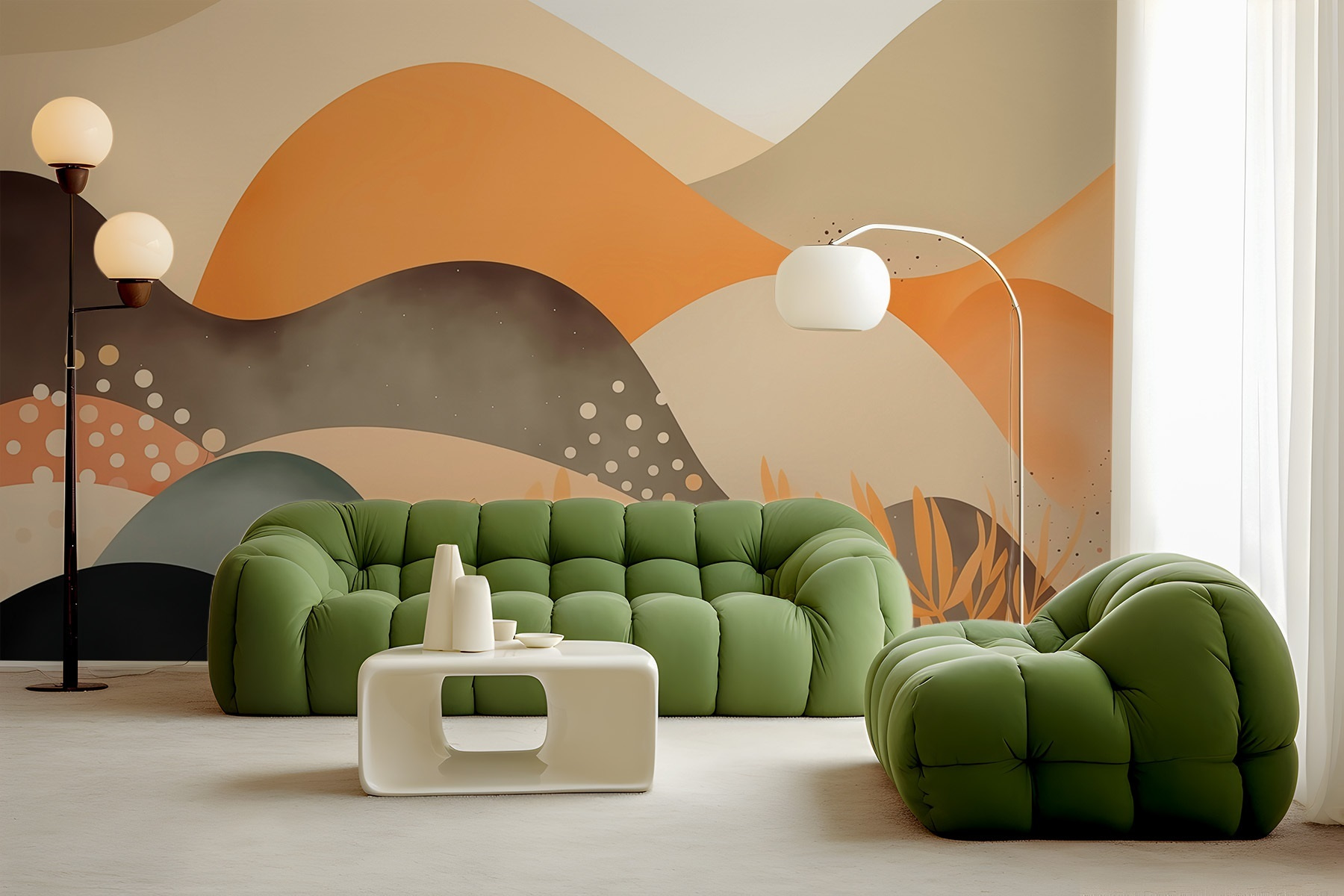 Transforme qualquer parede num refúgio sereno com este deslumbrante mural de paisagem do deserto. Imagine-se a beber chá gelado enquanto ondas suaves de tons quentes e curvas suaves trazem a tranquilidade do deserto para dentro de casa. É como ter um pedaço da natureza mesmo em casa – sem a areia nos sapatos! Os pormenores subtis – aqueles pontos divertidos e as sugestões de folhagem – fazem com que cada olhar pareça uma nova descoberta. Quer esteja a iluminar um recanto de leitura acolhedor ou a servir de pano de fundo vibrante para reuniões animadas, é difícil resistir ao encanto deste mural. Convida a uma sensação de calma, perfeita para momentos de reflexão ou inspiração. Imagine como esta beleza pode trazer uma sensação de aventura à vida quotidiana!