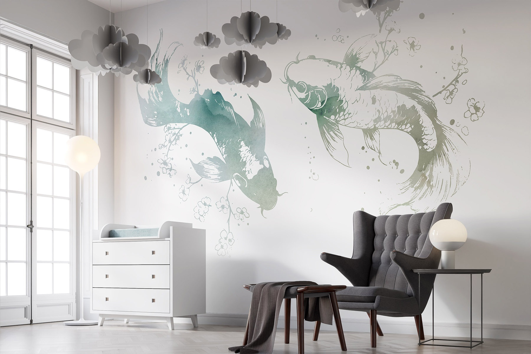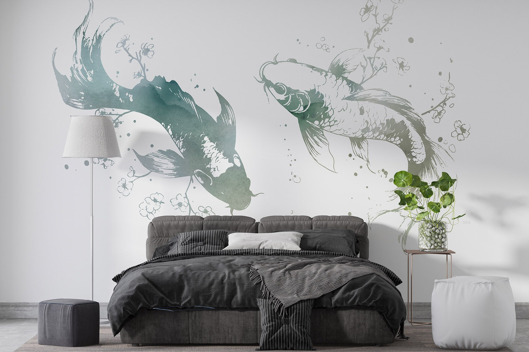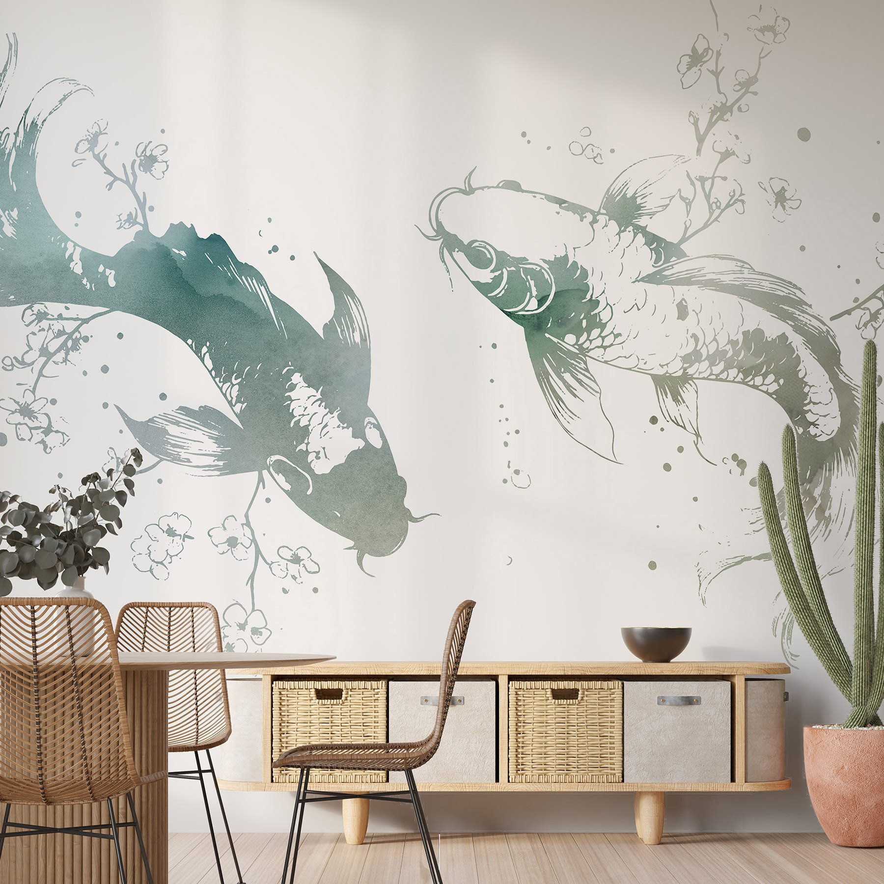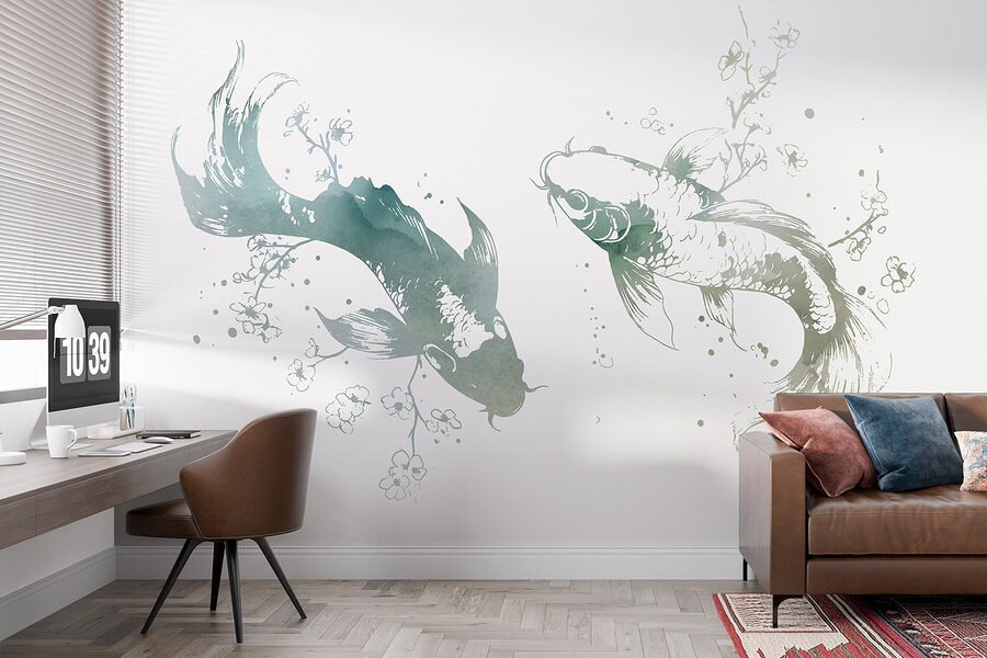 Transforme o seu espaço numa fuga serena com este mural cativante que apresenta dois graciosos peixes rodeados por delicadas flores e folhas. Imagine entrar na divisão e lá estão eles, a deslizar por entre aguarelas suaves que dão vida às suas paredes. É como ter uma pequena fatia da natureza mesmo em casa, invocando uma sensação de calma a cada olhar.