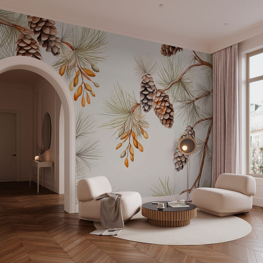 Transforme qualquer divisão num retiro florestal com este mural encantador, com uma bela dança de pinhas e agulhas. Imagine-se a aconchegar-se com uma chávena de café, com o aroma de pinho fresco a pairar no ar, enquanto este mural cria um cenário sereno. É como trazer o grande ar livre diretamente para a sua casa – não são necessárias botas de caminhada! Estes tons naturais fazem maravilhas, tornando os espaços quentes e convidativos. Quer se trate de uma sala de estar ou de um recanto acolhedor, este mural acrescenta um toque de beleza rústica que é obrigado a despertar alegria e talvez até uma ou duas aventuras ao ar livre.