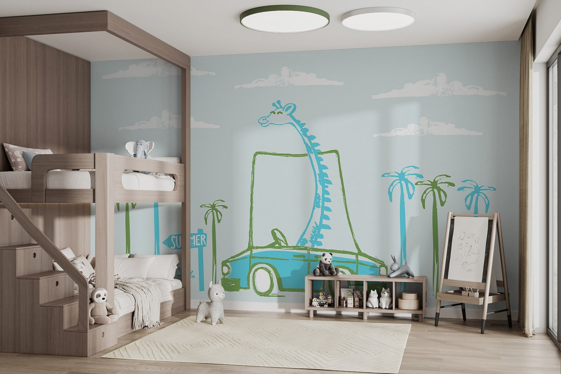 Dê um toque de capricho às suas paredes com o mural “Giraffe in a Car”. Este design encantador apresenta uma girafa encantadora a espreitar para fora de um carro azul vintage, rodeada por palmeiras divertidas e nuvens fofas. É como um bilhete para um dia de sol sempre que entra na sala. Imagine-se a beber café e a rir-se com a sua pura diversão. Perfeito para o quarto de uma criança ou para aquele canto peculiar da sua casa, este mural convida a sorrisos e desperta conversas. Além disso, quem não gostaria de ter uma girafa gigante como copiloto? Não é apenas decoração; é uma pequena aventura à espera de acontecer.