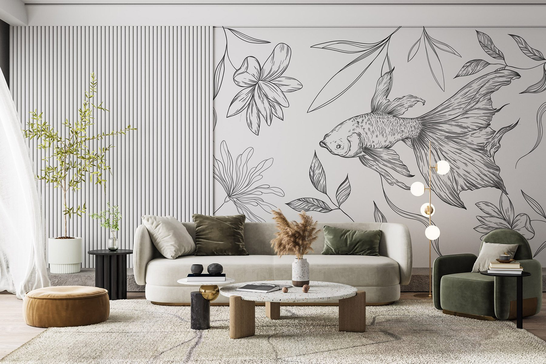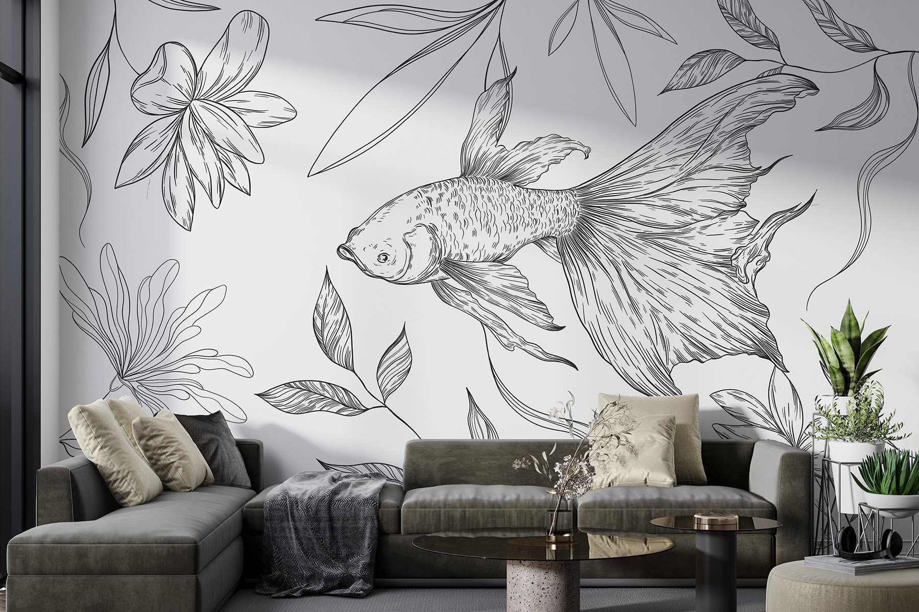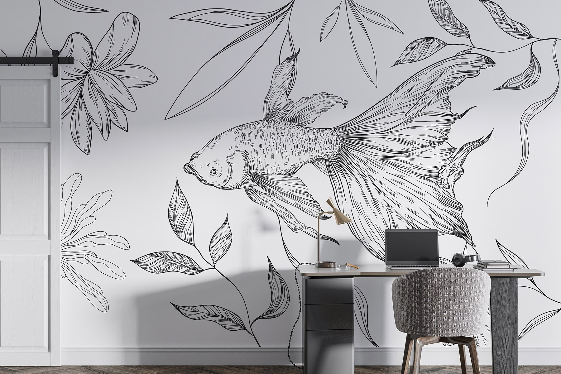 Transforme qualquer espaço com este mural cativante que apresenta um peixe encantador a deslizar entre plantas delicadas. O design a preto e branco confere um toque único, acrescentando um toque de elegância sem sobrecarregar a divisão. Imagine-se a beber café, com as linhas suaves a dançarem na parede, provocando pensamentos calmantes e ideias criativas. É como o sussurro da natureza, convidando à paz na sua azáfama. Perfeito para quem quer espalhar alguma magia artística nas suas paredes, é também um início de conversa. Quem não gostaria de falar sobre o “companheiro de natação” na sua parede?