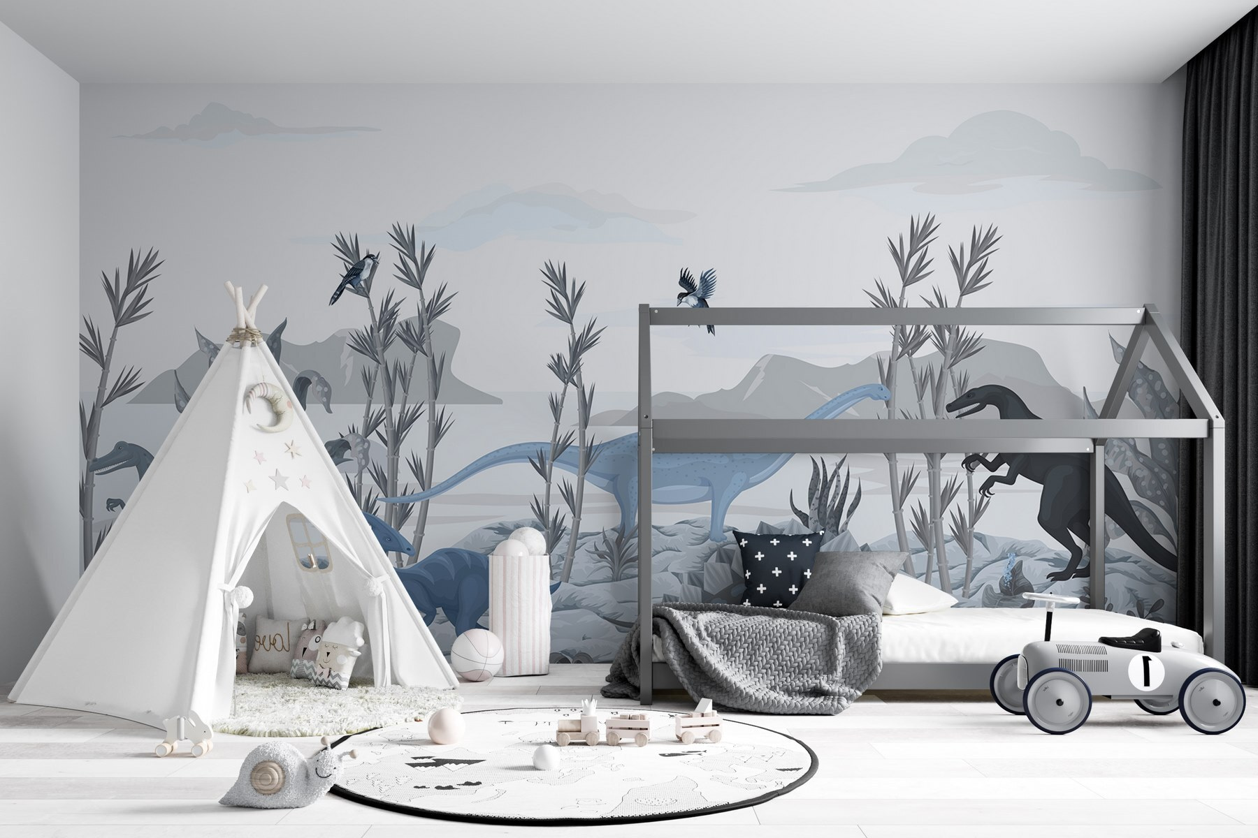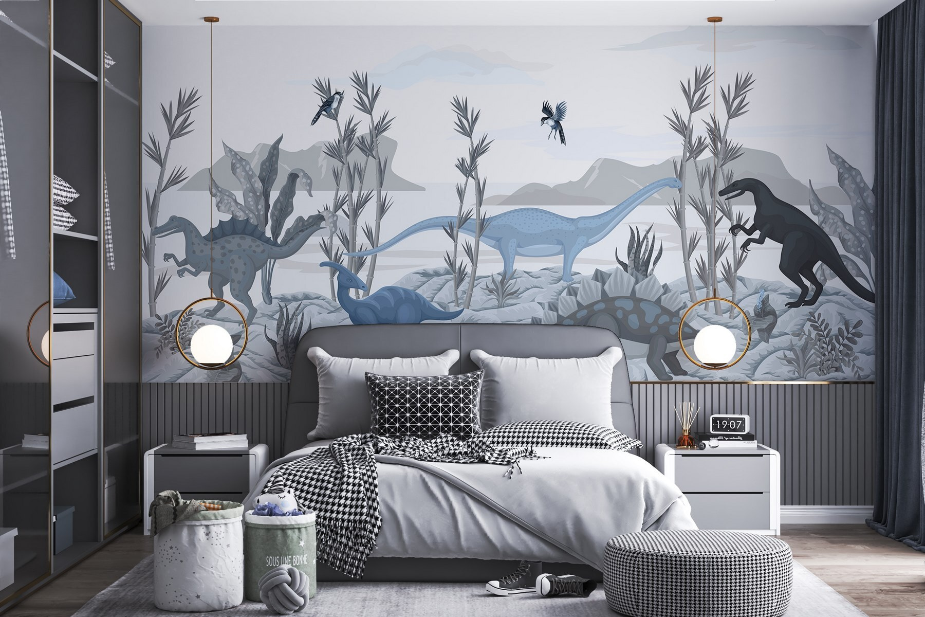 Transforme o espaço de uma criança numa aventura pré-histórica com este cativante mural de dinossauros. Imagine os mais pequenos de olhos brilhantes a descobrirem um mundo onde os gigantes vagueiam, com a sua imaginação a correr solta entre brontossauros gentis e T. rexes ferozes. As cores suaves e os pormenores intrincados da paisagem criam uma atmosfera serena, perfeita para sonhar acordado ou contar histórias. Pendure-o numa sala de jogos ou num quarto e veja como desperta a curiosidade e o espanto. Não se trata apenas de um mural – é um convite para explorar um mundo onde cada dia pode ser um pouco mais aventureiro. As crianças podem até começar a sonhar com escapadelas temáticas de dinossauros!
