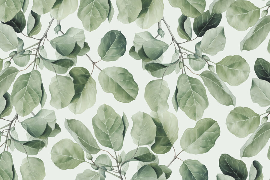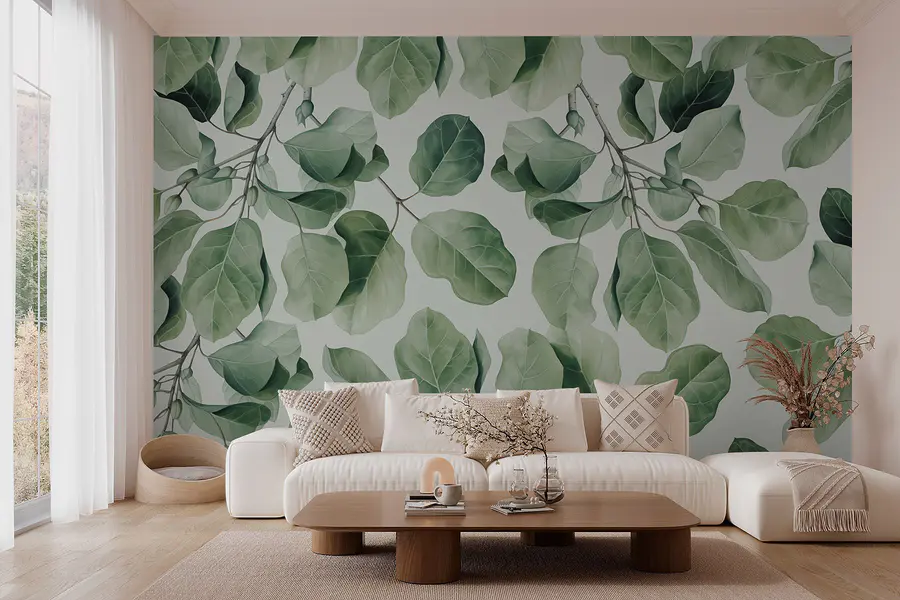 Transforme qualquer espaço num retiro sereno com este mural de folhas verdes exuberantes. Imagine entrar numa floresta tranquila – este design capta essa sensação na perfeição. O padrão suave e frondoso convida a uma lufada de ar fresco diretamente para a sua casa, dando-lhe vontade de descalçar os sapatos e relaxar. É como se a natureza decidisse ser o seu papel de parede, envolvendo-o em calor e calma. Perfeito para uma sala de estar acolhedora ou um escritório tranquilo, este mural eleva a vibração sem ser demasiado exigente. Quem precisa de férias quando pode ter uma fatia da natureza em casa?
