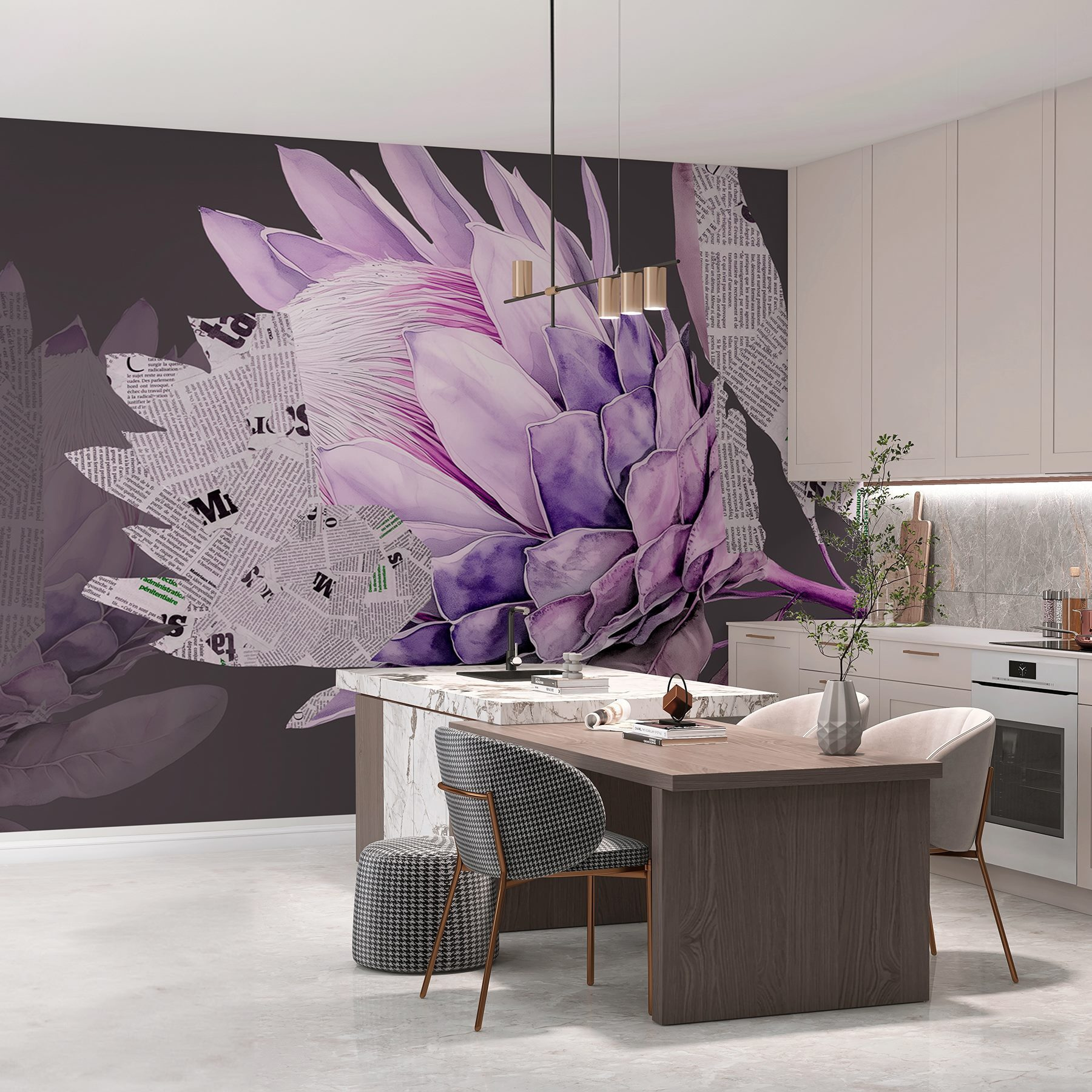 Transforme o seu espaço com este impressionante mural de parede, que apresenta uma deslumbrante flor roxa entrelaçada com pedaços de jornal. É como ter uma peça de arte que também sussurra histórias do passado. Imagine entrar numa sala e ser recebido por esta flor vibrante – não é apenas decoração, é uma experiência. Este mural traz um toque de criatividade, acrescentando um toque de capricho a qualquer parede. Perfeito para quem aprecia a beleza da natureza e o encanto da impressão vintage, cria uma atmosfera convidativa que estimula a conversa. A cada olhar, parece uma lufada de ar fresco em sua casa.