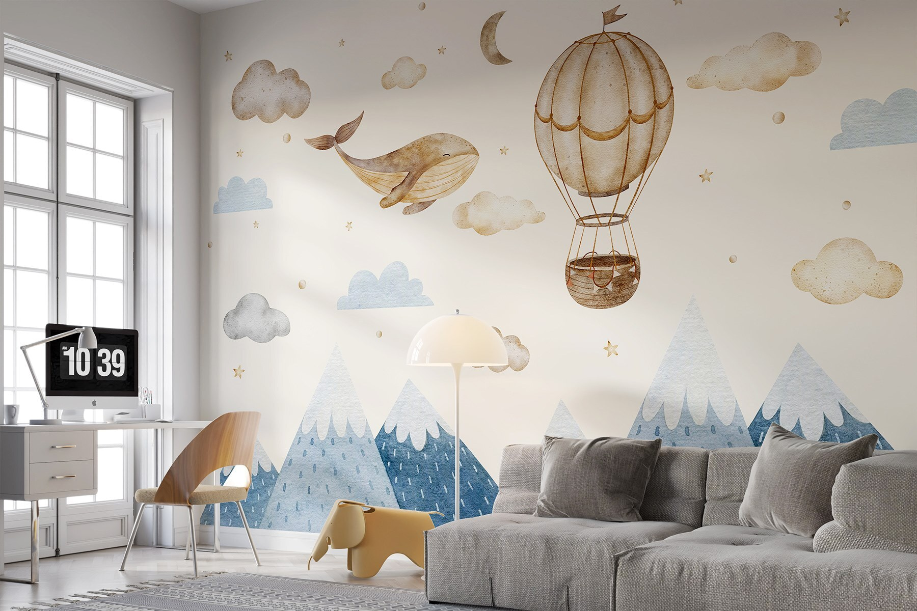 Imagine entrar numa sala cheia de nuvens, estrelas e uma baleia brincalhona a voar ao lado de um balão de ar quente caprichoso. Este mural não é apenas uma decoração; é uma aventura à espera de acontecer! Imagine as crianças, de olhos arregalados, a imaginarem que estão numa viagem aos céus, enquanto os adultos não podem deixar de sorrir com a cena encantadora. A paleta de cores suaves proporciona uma vibração calma – óptima para quartos ou recantos acolhedores. Quer esteja a sonhar, a deixar os seus pensamentos à deriva ou apenas a ter um momento de paz, este mural acrescenta um toque único que parece mágico e divertido. Perfeito para dar asas à imaginação!