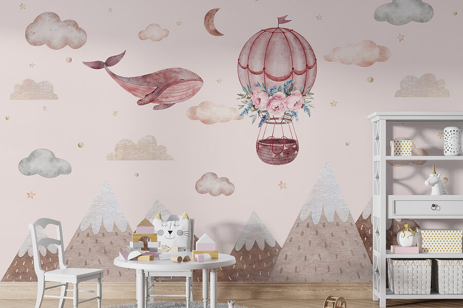 Imagine um mundo caprichoso onde as baleias deslizam pelo céu – sim, isso está a acontecer aqui mesmo com este mural! Com um encantador balão de ar quente adornado com flores delicadas, é uma cena deliciosa que desperta a imaginação. Imagine-o a transformar o quarto de uma criança ou um recanto de leitura acolhedor numa fuga de sonho. As cores suaves e as suaves montanhas criam um ambiente sereno, perfeito para descontrair com um bom livro ou sonhar acordado. É como uma pequena aventura mesmo na parede – quem não gostaria de navegar pelas nuvens com uma baleia amigável? Basta pendurá-lo e deixar que a magia se desenrole!