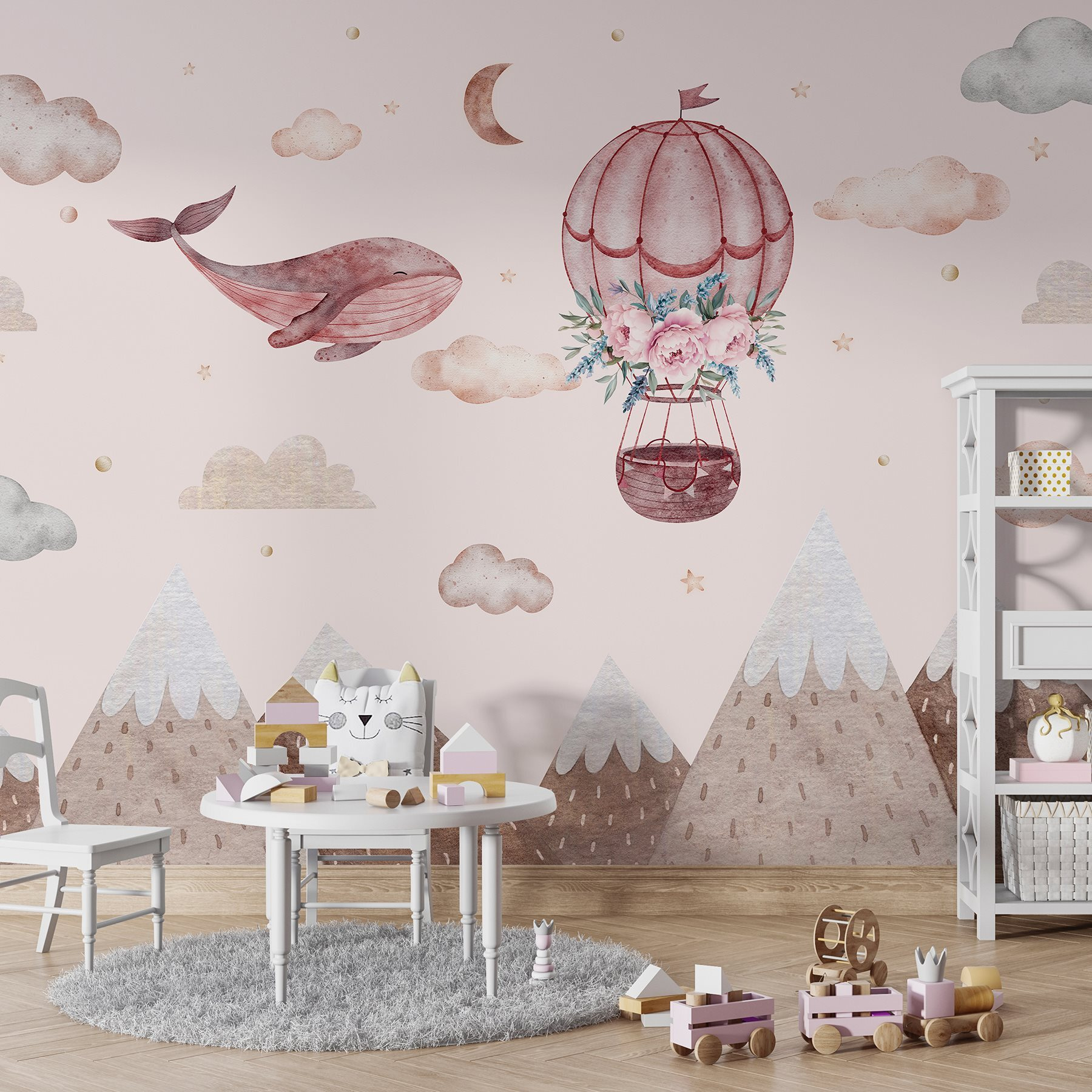 Imagine um mundo caprichoso onde as baleias deslizam pelo céu – sim, isso está a acontecer aqui mesmo com este mural! Com um encantador balão de ar quente adornado com flores delicadas, é uma cena deliciosa que desperta a imaginação. Imagine-o a transformar o quarto de uma criança ou um recanto de leitura acolhedor numa fuga de sonho. As cores suaves e as suaves montanhas criam um ambiente sereno, perfeito para descontrair com um bom livro ou sonhar acordado. É como uma pequena aventura mesmo na parede – quem não gostaria de navegar pelas nuvens com uma baleia amigável? Basta pendurá-lo e deixar que a magia se desenrole!
