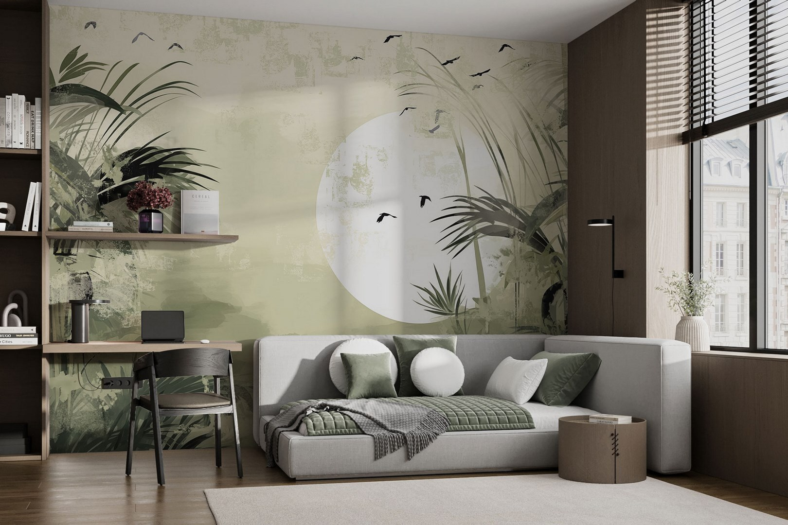 Transforme qualquer divisão num retiro sereno com este mural de floresta tropical – é como trazer uma fatia da selva para dentro de casa, sem os insectos. Imagine-se a beber o seu café da manhã enquanto contempla uma vegetação luxuriante e uma lua de sonho de grandes dimensões. Este mural não se limita a decorar; evoca uma sensação de calma, perfeita para descontrair após um longo dia. Os amigos vão entrar e sentir-se como se tivessem entrado num refúgio de floresta tropical. É o tipo de pano de fundo que convida a sonhar acordados e a iniciar conversas. Quem diria que uma parede poderia transportar alguém para o paraíso?