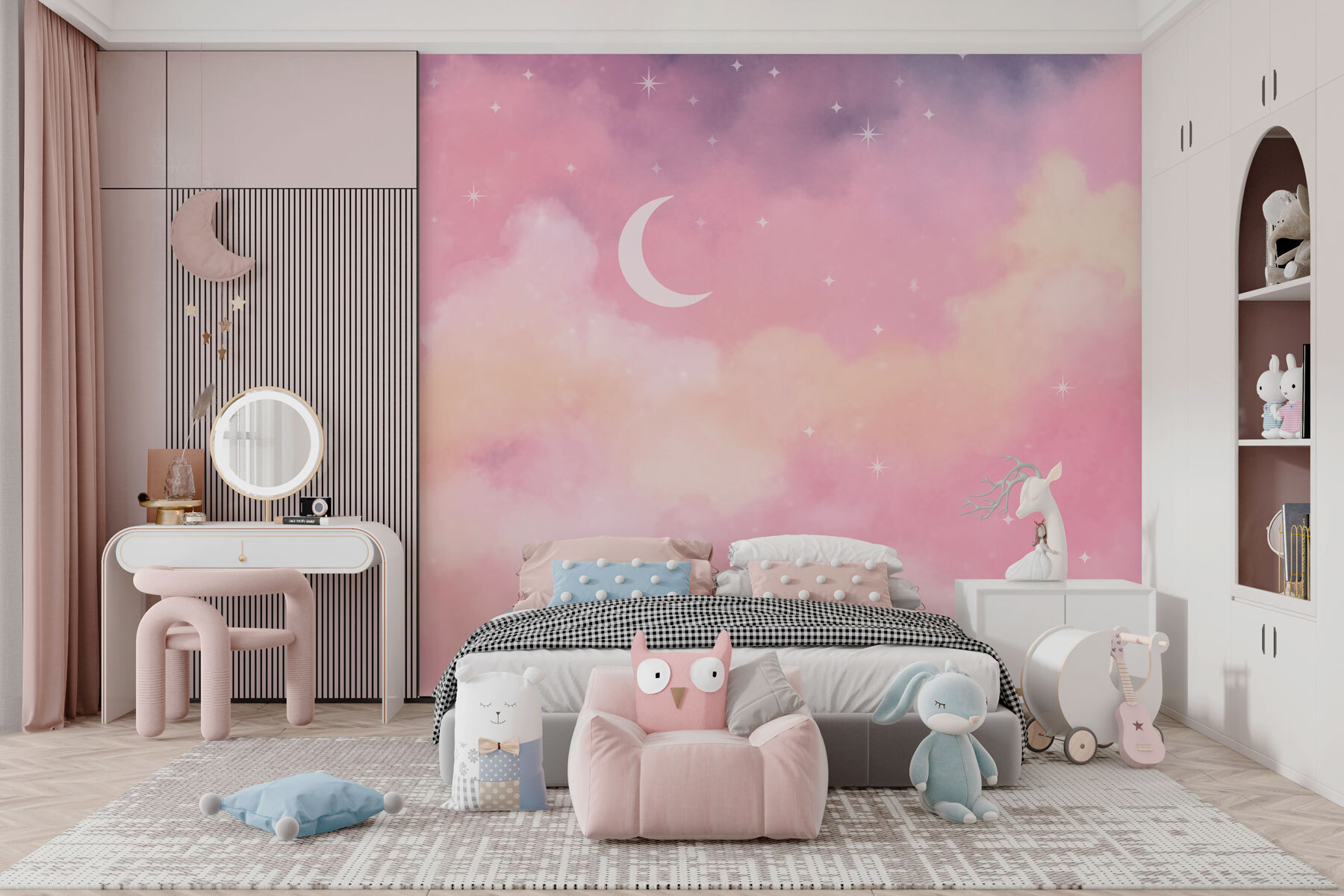 Transforme o quarto de uma criança num céu noturno de sonho com este mural encantador de tons rosa suaves, estrelas delicadas e uma suave lua crescente. Imagine histórias de embalar a desenrolar-se sob um teto estrelado, onde cada olhar inspira admiração. Perfeito para despertar sonhos de aventura e exploração, cria um ambiente sereno, transformando qualquer espaço num retiro acolhedor. É como trazer um pequeno pedaço do universo para dentro de casa – perfeito para adormecer ou aconchegar-se com um bom livro. Imagine os olhos sonolentos a iluminarem-se quando vêem esta cena mágica!
