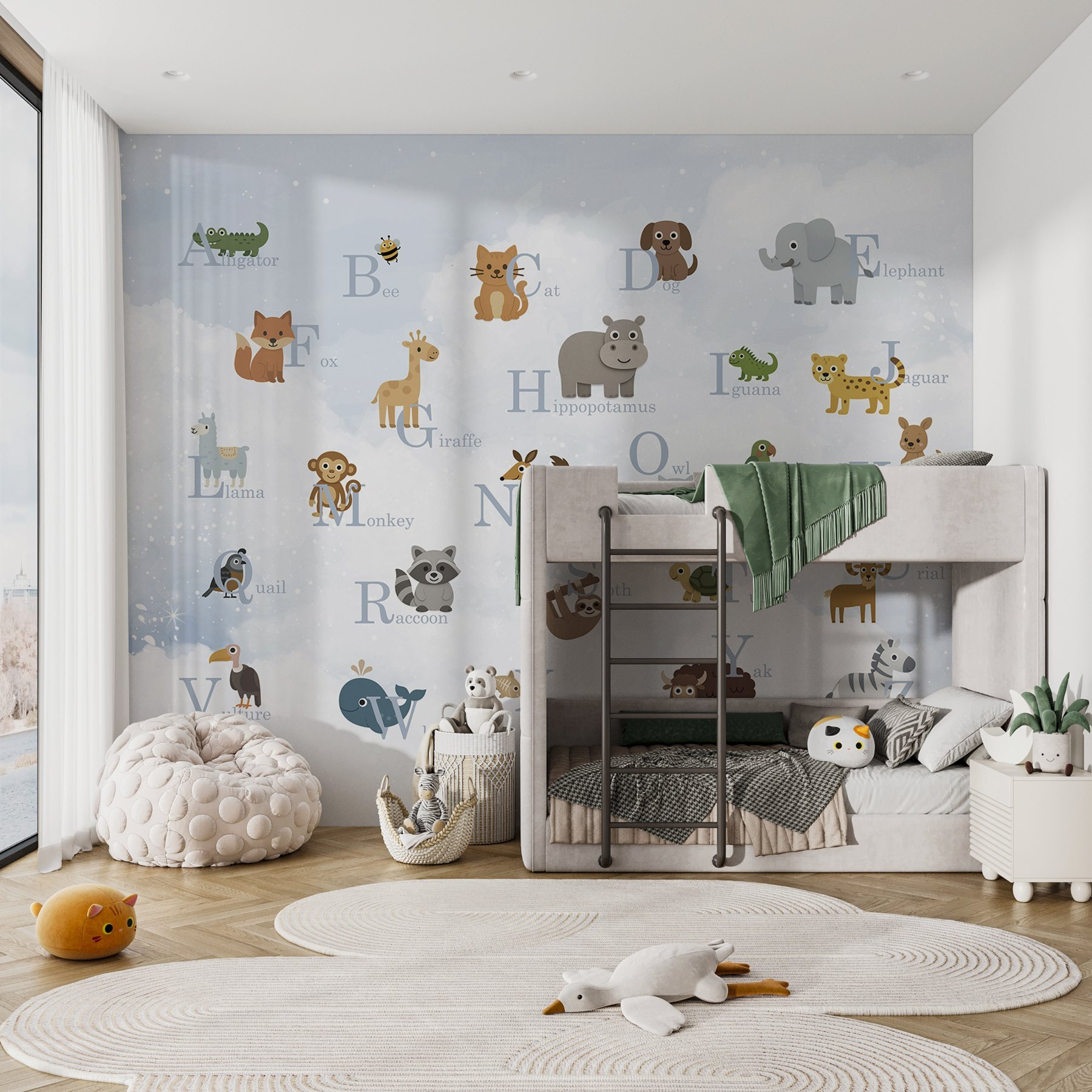 Transforme o espaço de qualquer criança numa selva vibrante de diversão com este mural de parede encantador, com um elenco de animais encantadores juntamente com as letras correspondentes. É como um jardim zoológico e o alfabeto num só! Imagine uma raposa brincalhona, uma girafa pateta e uma coruja sábia a trazerem uma aventura diretamente para as suas paredes – garantidamente para despertar a curiosidade e as gargalhadas.