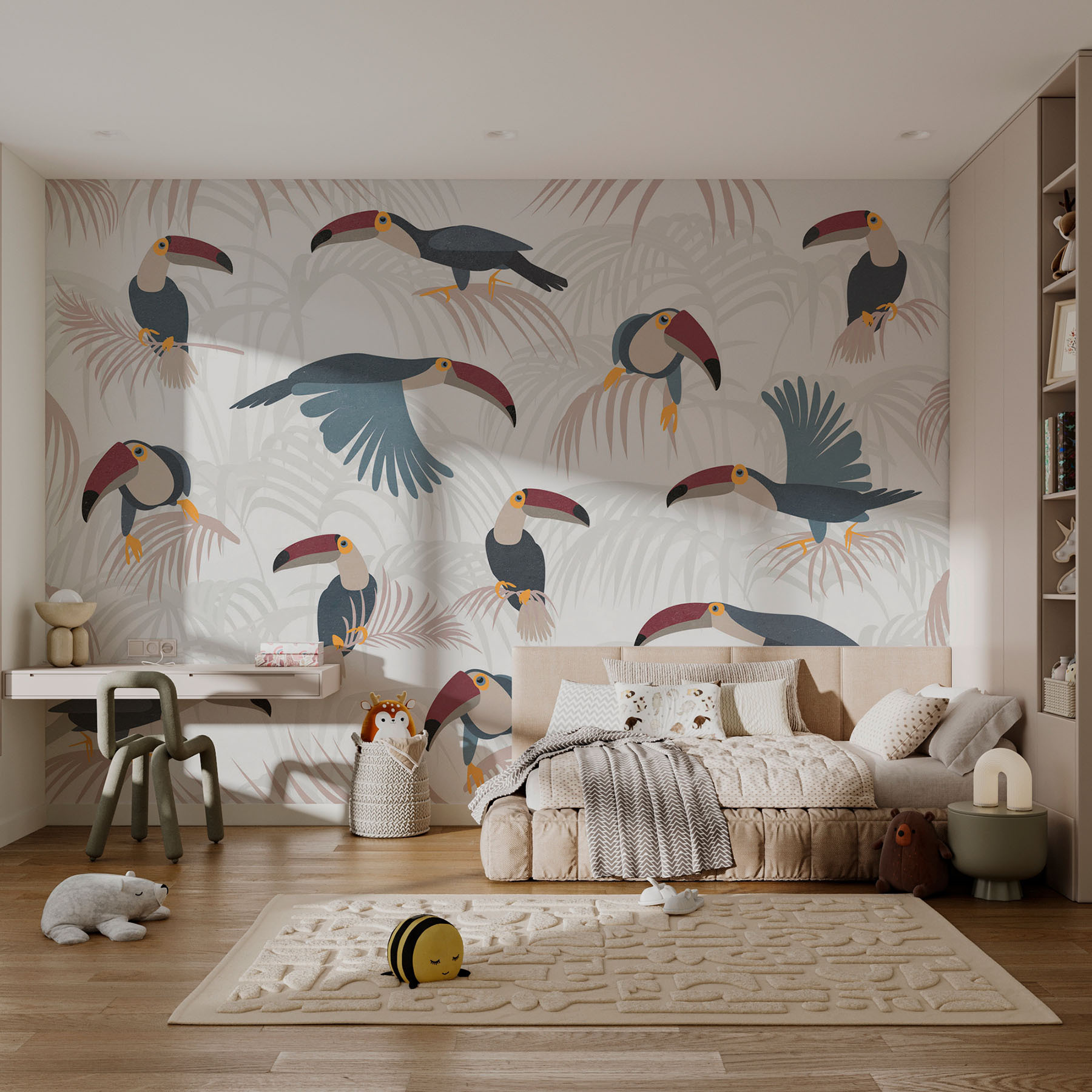 Imagine entrar num espaço que parece um retiro tropical, onde os padrões vibrantes de pássaros e plantas exuberantes elevam instantaneamente o seu espírito. Este mural, repleto de tucanos peculiares empoleirados entre folhas de palmeira divertidas, traz calor e capricho a qualquer parede. É como ter uma pequena fatia alegre da natureza dentro de casa – perfeito para aqueles dias em que só quer fugir! Quer esteja a iluminar uma sala de estar acolhedora ou a dar um toque especial a um escritório em casa, este mural convida-o a descontrair com estilo. Quem não sorriria ao ver estes pássaros curiosos? Deixe as cores dançarem à sua volta e transforme qualquer divisão num paraíso alegre.