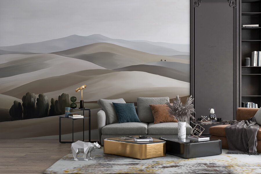 Transforme qualquer parede numa fuga serena com este belo mural de colinas e árvores. Traz o ar livre diretamente para o seu espaço de vida – perfeito para sonhar acordado ou simplesmente descontrair após um longo dia. Imagine-se a beber café enquanto se delicia com os tons suaves e discretos que criam uma atmosfera tranquila. Este mural não se limita a fazer uma afirmação; sussurra calma. É como ter uma paisagem pessoal que muda a vibração do seu quarto, fazendo-o sentir-se aberto e fresco. Perfeito para os amantes da natureza ou para qualquer pessoa que queira dar um toque de tranquilidade à sua casa.