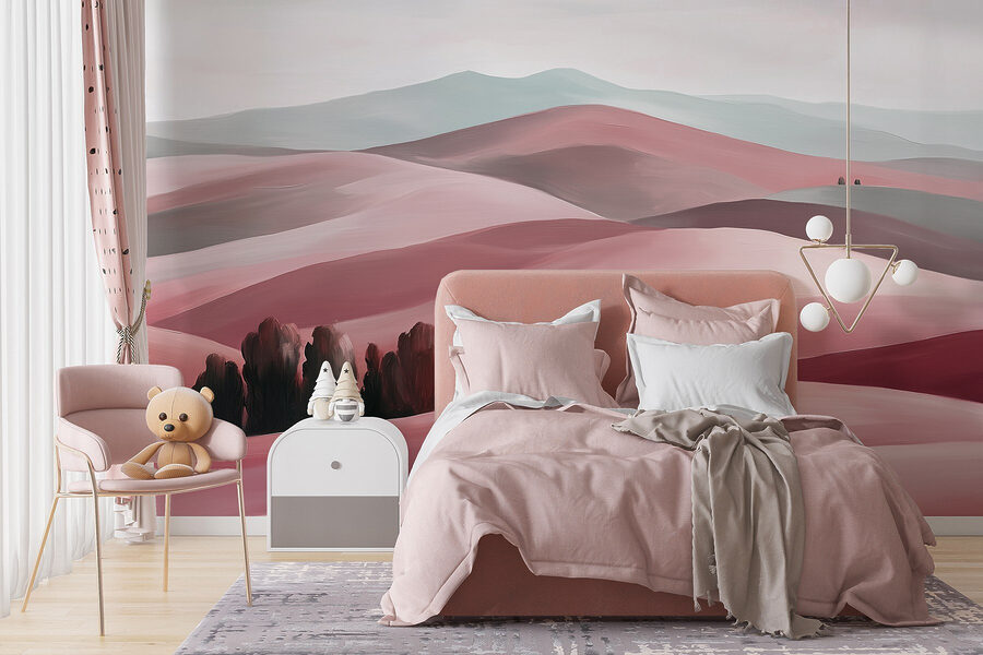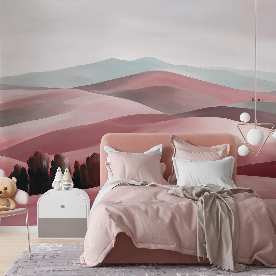 Transforme uma parede simples numa fuga de sonho com o mural “Paisagem de colinas com árvores”. Imagine entrar numa sala que imediatamente parece um retiro sereno, onde colinas suaves rolam sob um céu suave. Os tons subtis de rosa e cinzento convidam à calma e ao calor, perfeitos para conversas aconchegantes ou para sonhar acordado com uma chávena de chá.