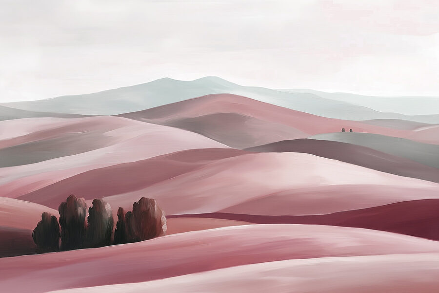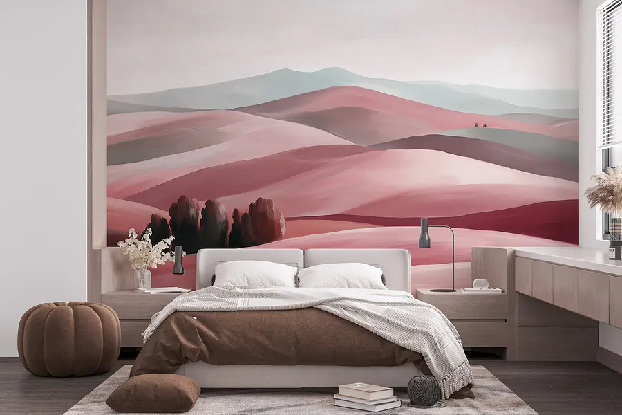 Transforme uma parede simples numa fuga de sonho com o mural “Paisagem de colinas com árvores”. Imagine entrar numa sala que imediatamente parece um retiro sereno, onde colinas suaves rolam sob um céu suave. Os tons subtis de rosa e cinzento convidam à calma e ao calor, perfeitos para conversas aconchegantes ou para sonhar acordado com uma chávena de chá.