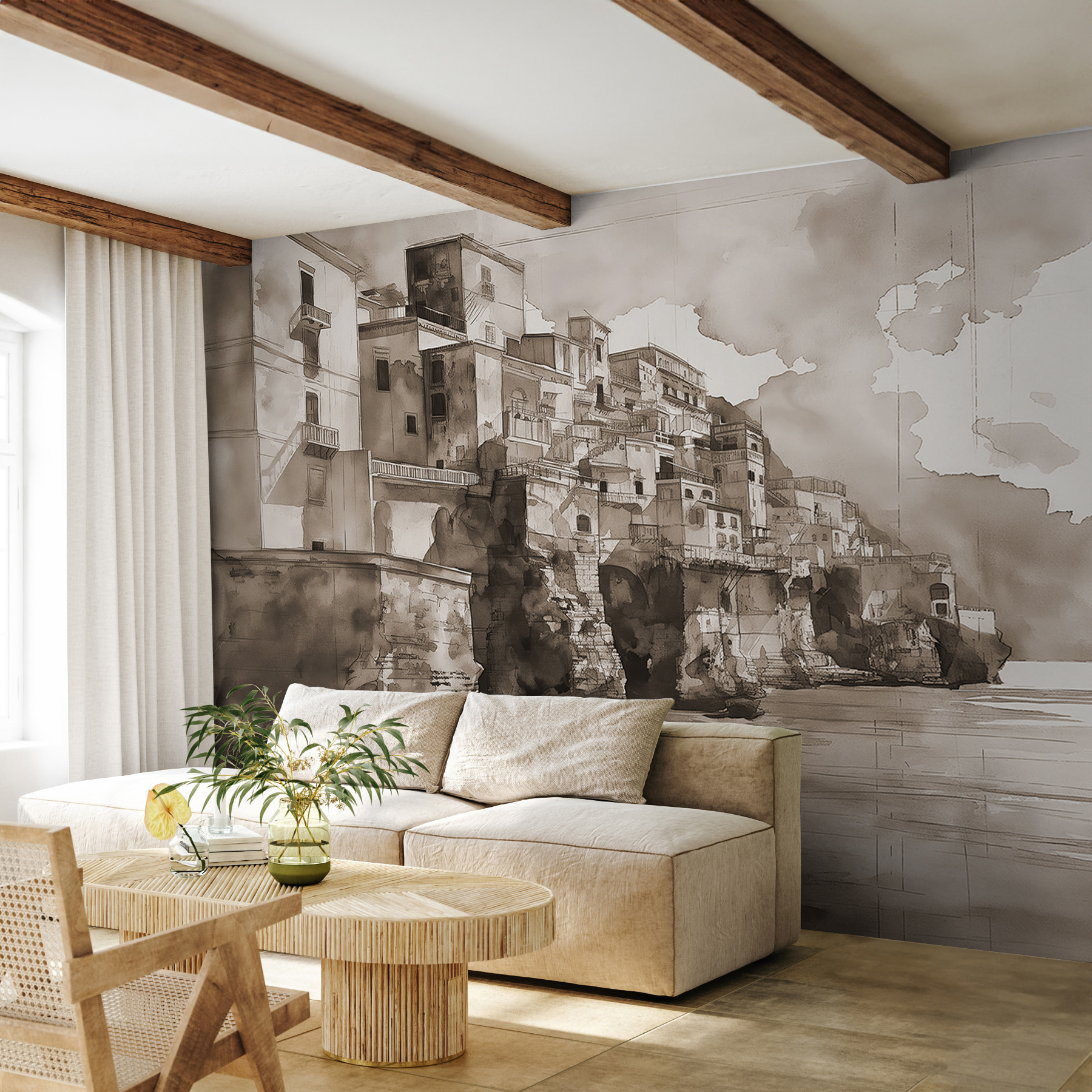 Imagine acordar e ver uma paisagem urbana que parece sussurrar histórias de becos escondidos e mercados movimentados. Este mural de aguarela envolve-o no encanto de uma cidade do velho mundo, mesmo na sua sala de estar. É como ter umas mini-férias sempre que se olha para cima. Os tons suaves e as lavagens de cor criam uma vibração calmante, perfeita para despertar um ou dois devaneios. Quer esteja a relaxar com uma chávena de café ou a receber amigos, este mural vai certamente iniciar algumas conversas – talvez até levar a um plano de viagem espontâneo!