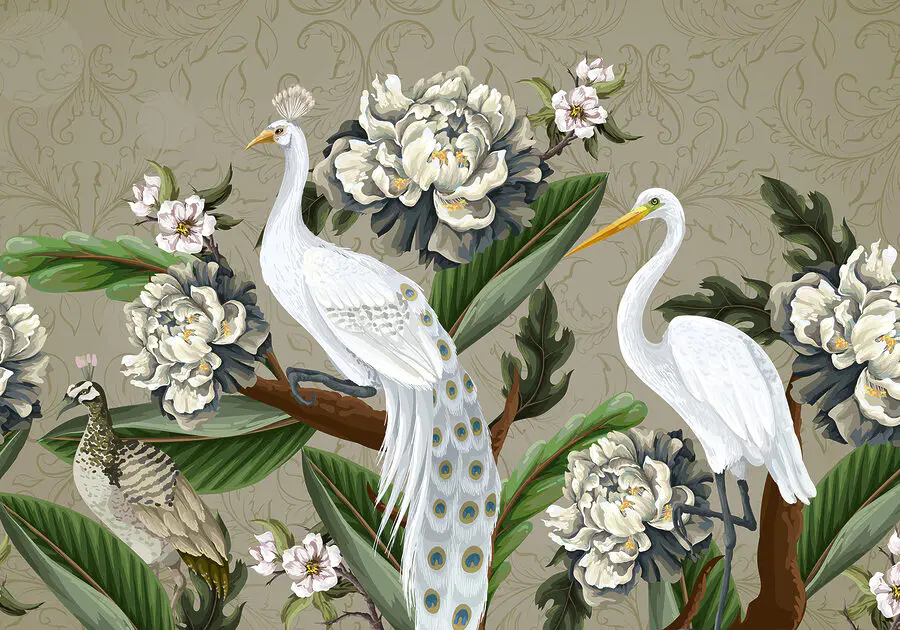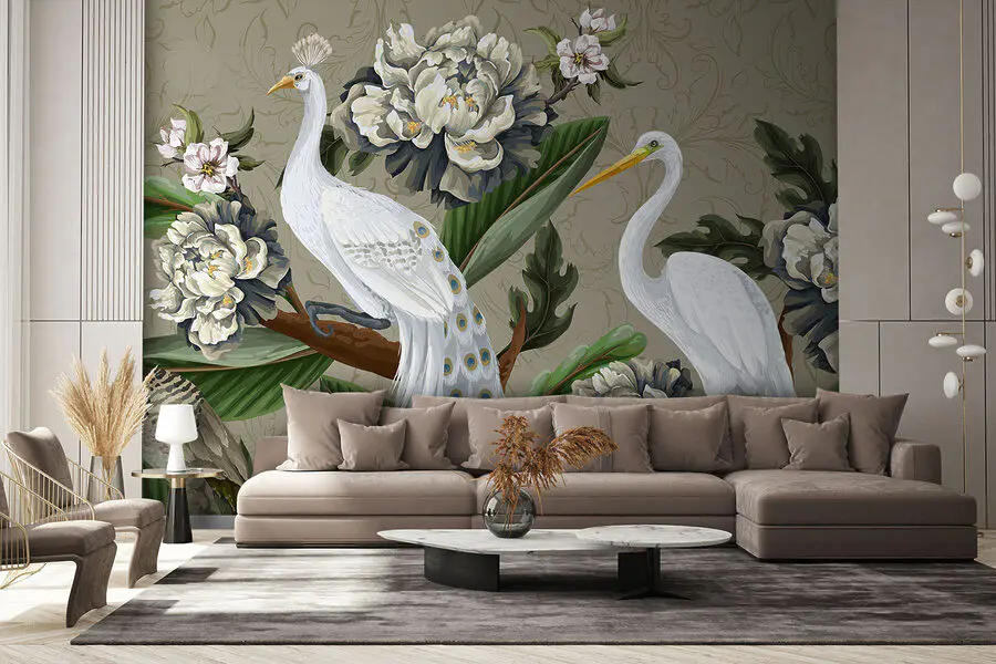 Imagine o tipo de elegância descontraída que este mural traz – as suas paredes contam uma história de sonho de um tranquilo paraíso botânico. É ideal para alguém que adora a natureza mas também aprecia um toque de sofisticação. Os pavões e as flores são tão detalhados que pode sentir-se como se estivesse a passear num jardim exótico. Perfeito para criar aquele fator “uau” quando os amigos nos visitam – é garantido que vai dar que falar!