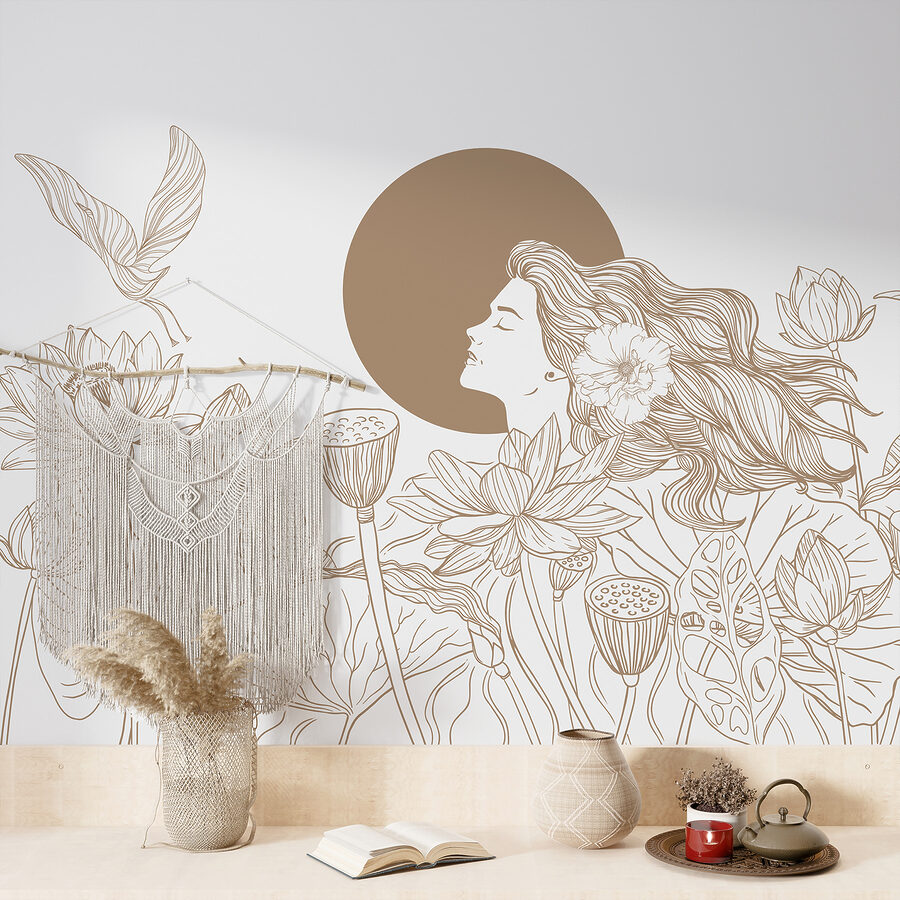 Transforme qualquer espaço numa fuga serena com este deslumbrante mural de parede com uma mulher rodeada de flores delicadas. Imagine isto: depois de um longo dia, entra no seu quarto e é recebido por flores calmantes e uma vibração tranquila – como um mini santuário mesmo em casa. O fluxo suave do seu cabelo e as linhas suaves criam uma atmosfera convidativa. É perfeito para um recanto acolhedor ou como uma peça de afirmação que suscita conversas. Imagine-se a beber chá enquanto contempla esta cena de sonho e sente o stress a desaparecer. Simples, mas encantador! As suas paredes vão agradecer-lhe.