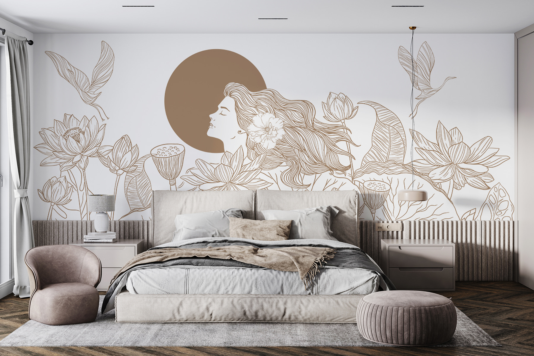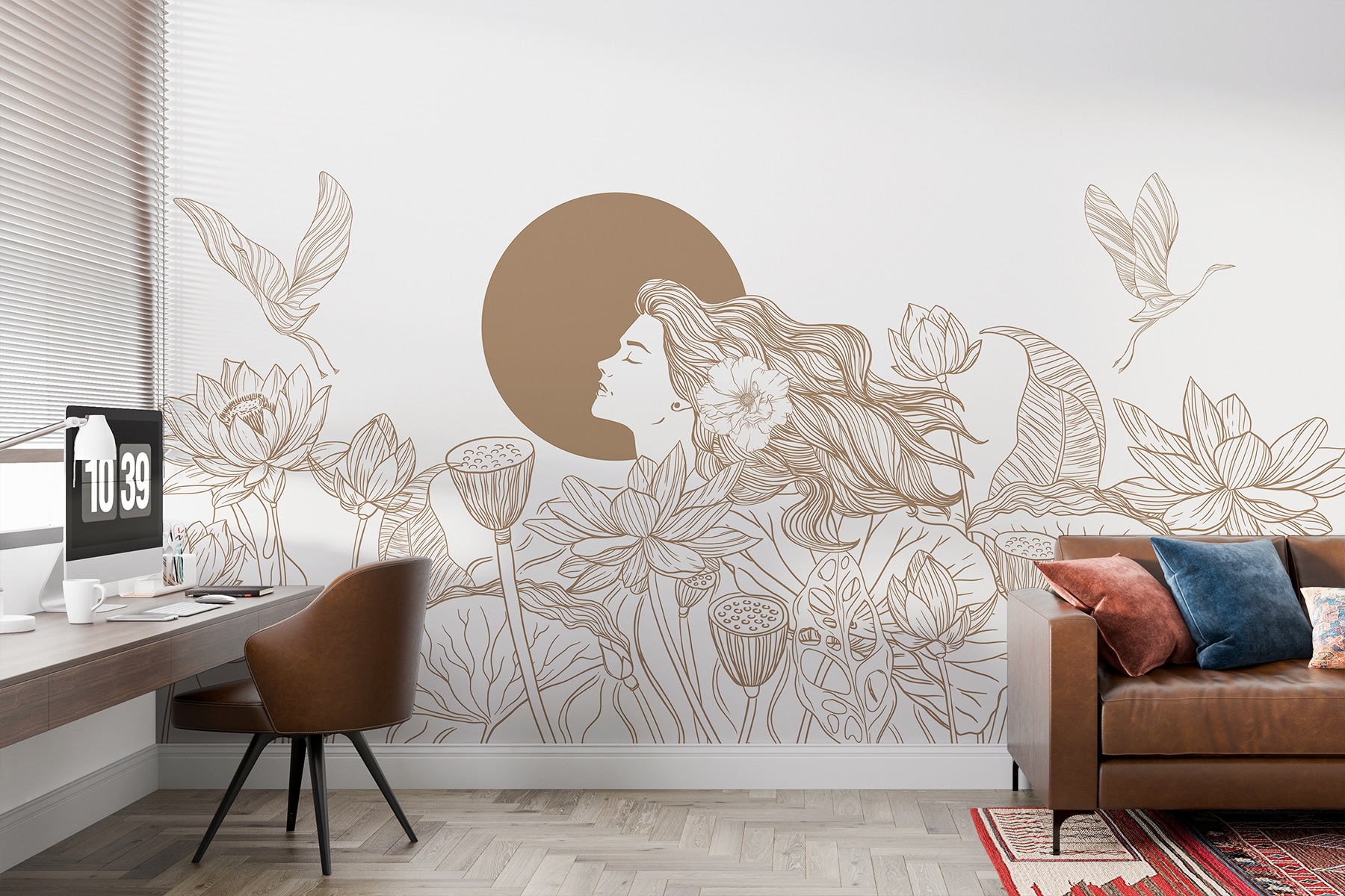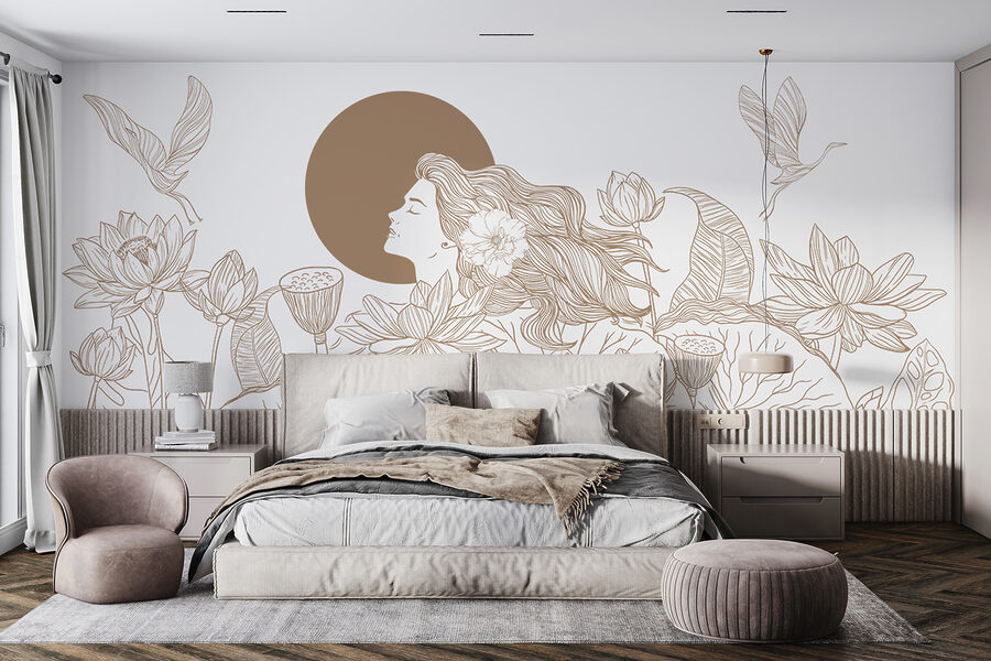 Transforme qualquer espaço numa fuga serena com este deslumbrante mural de parede com uma mulher rodeada de flores delicadas. Imagine isto: depois de um longo dia, entra no seu quarto e é recebido por flores calmantes e uma vibração tranquila – como um mini santuário mesmo em casa. O fluxo suave do seu cabelo e as linhas suaves criam uma atmosfera convidativa. É perfeito para um recanto acolhedor ou como uma peça de afirmação que suscita conversas. Imagine-se a beber chá enquanto contempla esta cena de sonho e sente o stress a desaparecer. Simples, mas encantador! As suas paredes vão agradecer-lhe.