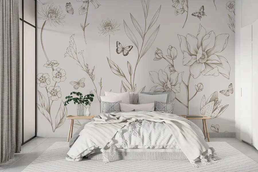 Alguma vez sonhou em trazer a serenidade de um prado ensolarado de flores silvestres para o seu espaço – mas sem os insectos? Veja este adorável “Fotomurais w08088v1” das nossas categorias Fotomurais de borboletas e Natureza. É como se alguém tivesse capturado um delicado esboço a lápis de um jardim, salpicado de borboletas. Imagine só: aquelas folhas e flores finamente desenhadas a criar um pano de fundo subtil e elegante. Porreiro, não é?