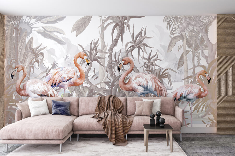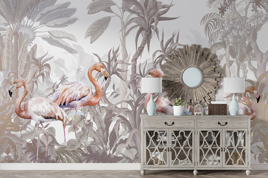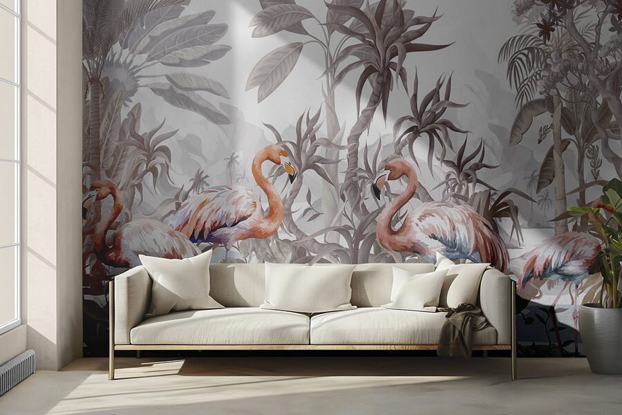 Entre num mundo caprichoso com este mural de flamingos. Imagine-se a beber o seu café da manhã enquanto estes elegantes pássaros – empoleirados no meio de uma exuberante folhagem tropical – iluminam o seu espaço. Os tons suaves criam uma vibração serena, quase como se estivesse numas mini-férias todos os dias. Perfeito para dar um toque de natureza à sua sala de estar ou ao seu quarto. É como ter um pedaço de paraíso escondido na parede. Quem diria que os flamingos poderiam ser os seus novos melhores amigos na decoração? A sofisticação das penas encontra o charme descontraído.