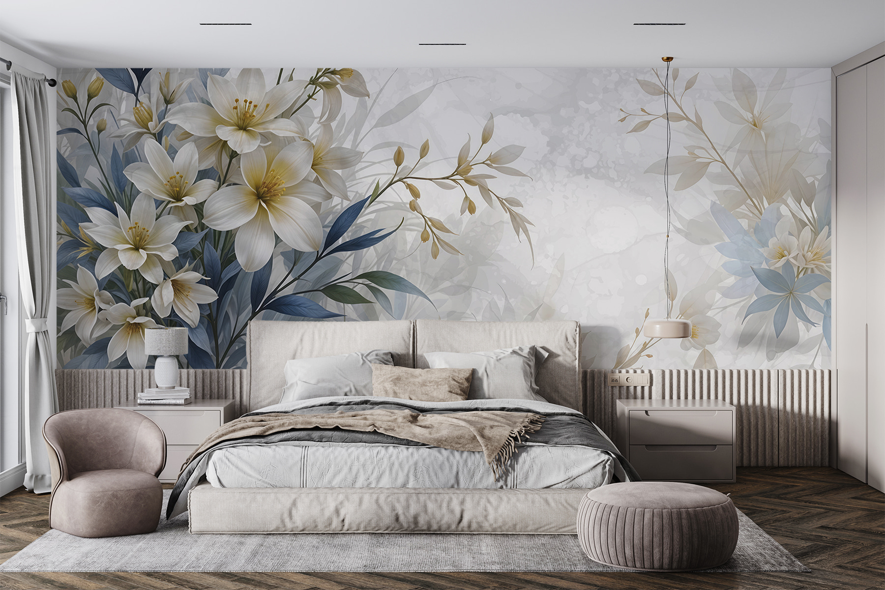 Imagine entrar numa sala e ser recebido por uma deliciosa dança de flores e folhas. Este mural é mais do que uma simples decoração; é um sussurro da natureza capturado na sua parede. As flores suaves e sonhadoras e as folhas exuberantes podem transformar qualquer espaço num santuário de jardim sereno. É o tipo de obra de arte que dá vontade de se sentar com uma chávena de chá, respirar profundamente e talvez até sonhar um pouco acordado. Perfeita para quem quer um toque de tranquilidade – ou um início de conversa que nunca murcha!