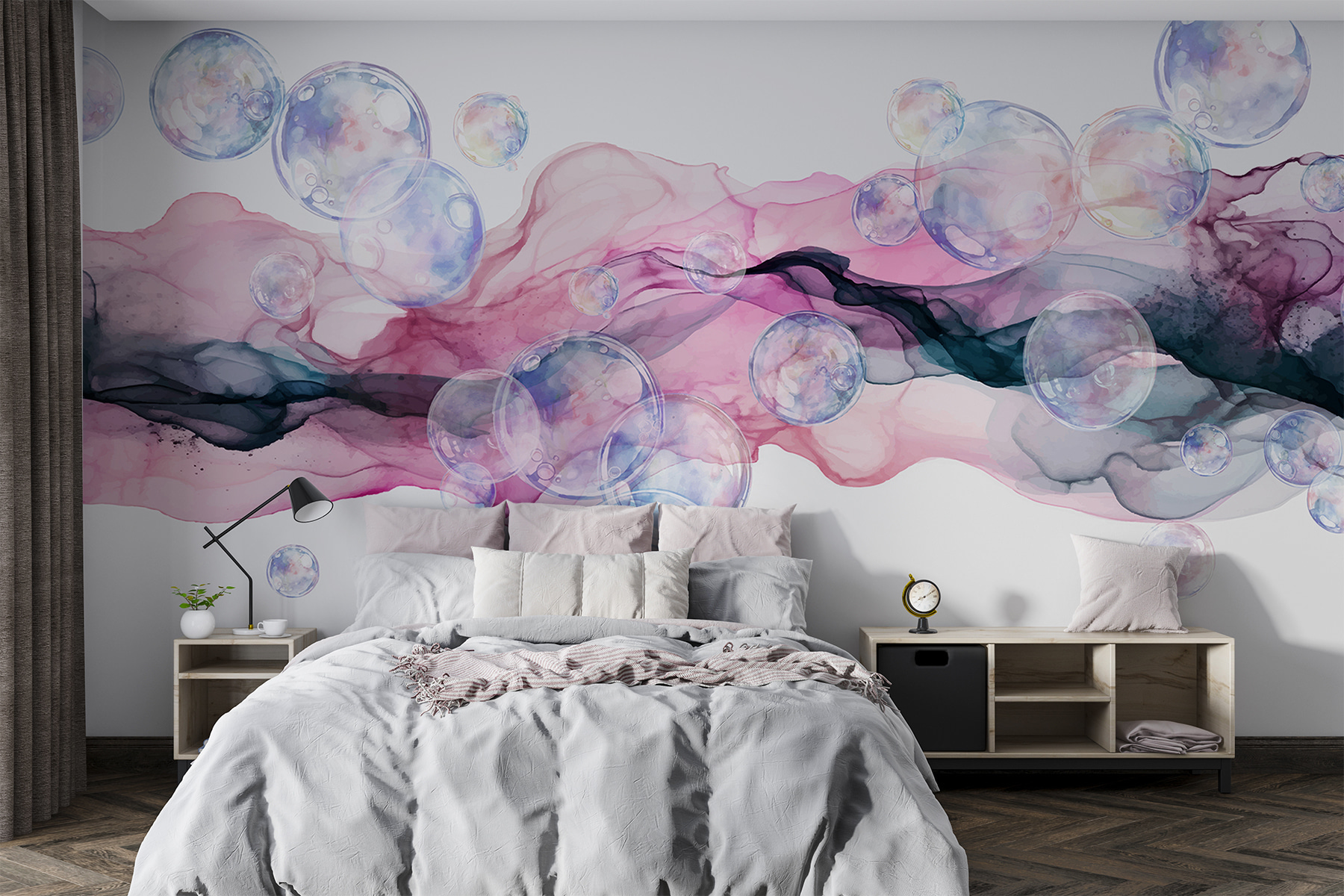 Imagine um sonho tornado tangível – este mural é pura magia. Estas bolhas, como sussurros suaves, flutuam numa dança encantadora de rosas e roxos. Alguma vez sentiu vontade de entrar numa pintura de aguarela? Aqui está a sua oportunidade. O seu quarto pode ser um oásis de calma ou um universo caprichoso, onde a criatividade flui. Sinta a serenidade a inundá-lo quando a luz atinge estes tons delicados, lançando reflexos suaves. Perfeito para quem acredita na beleza da imaginação – e quem é que não precisa de um pouco mais de capricho na sua vida?