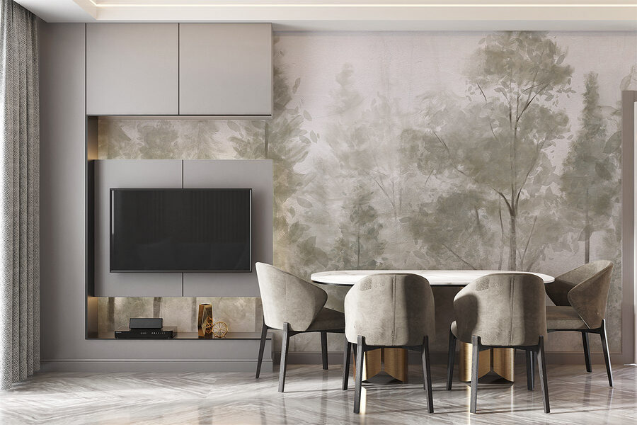 Os tons suaves de verde e cinzento criam uma atmosfera tranquila, tornando-a perfeita para vários estilos de decoração. Imagine-se a beber o seu café da manhã enquanto contempla este cenário tranquilo – quem precisa de uma cabana no bosque quando pode ter isto? Deixe que os sussurros da natureza preencham o seu espaço e, quem sabe, até despertem algum devaneio. Não se trata apenas de decoração; é um escape diário.