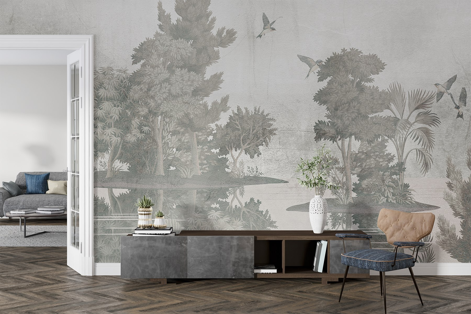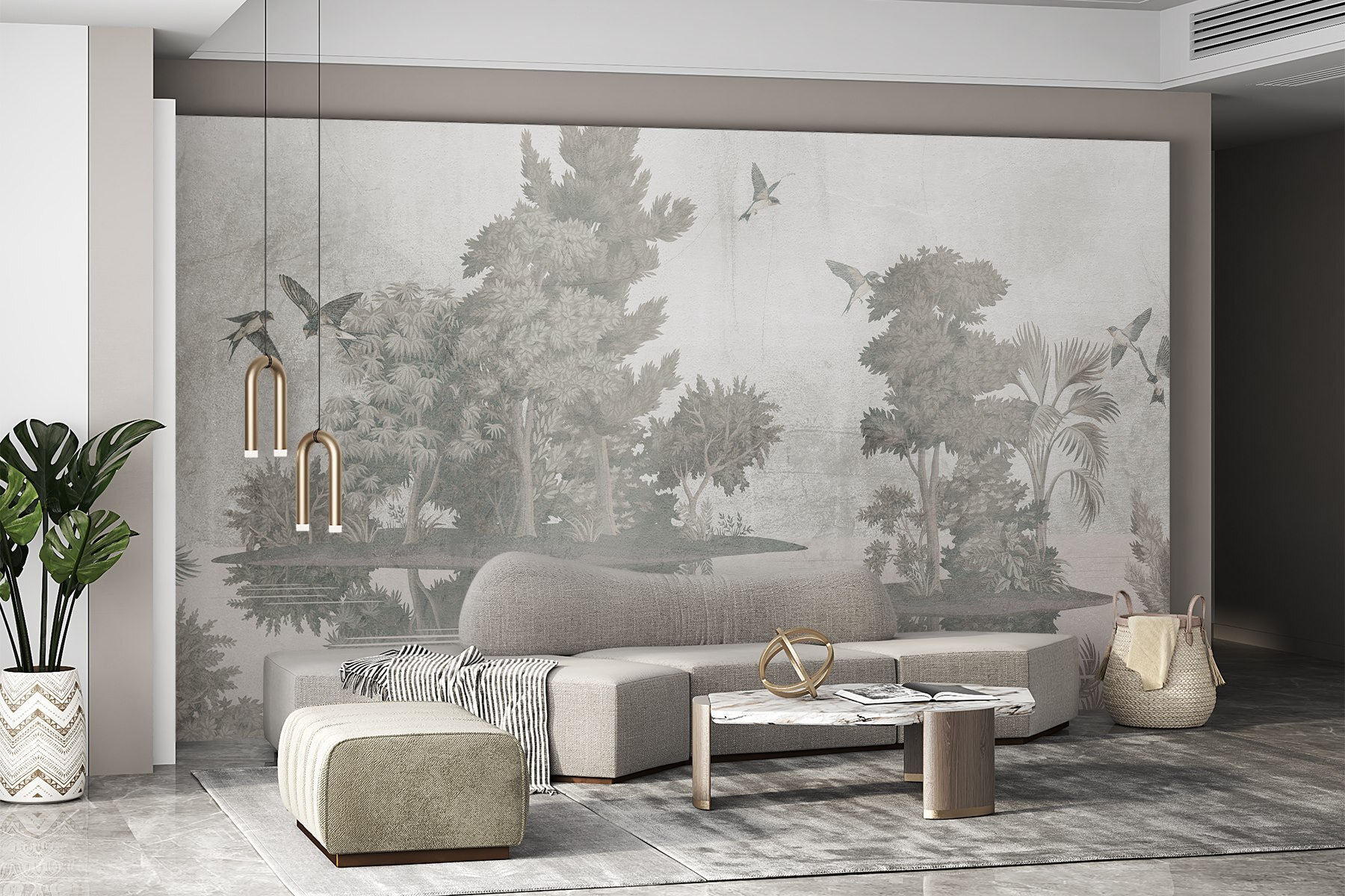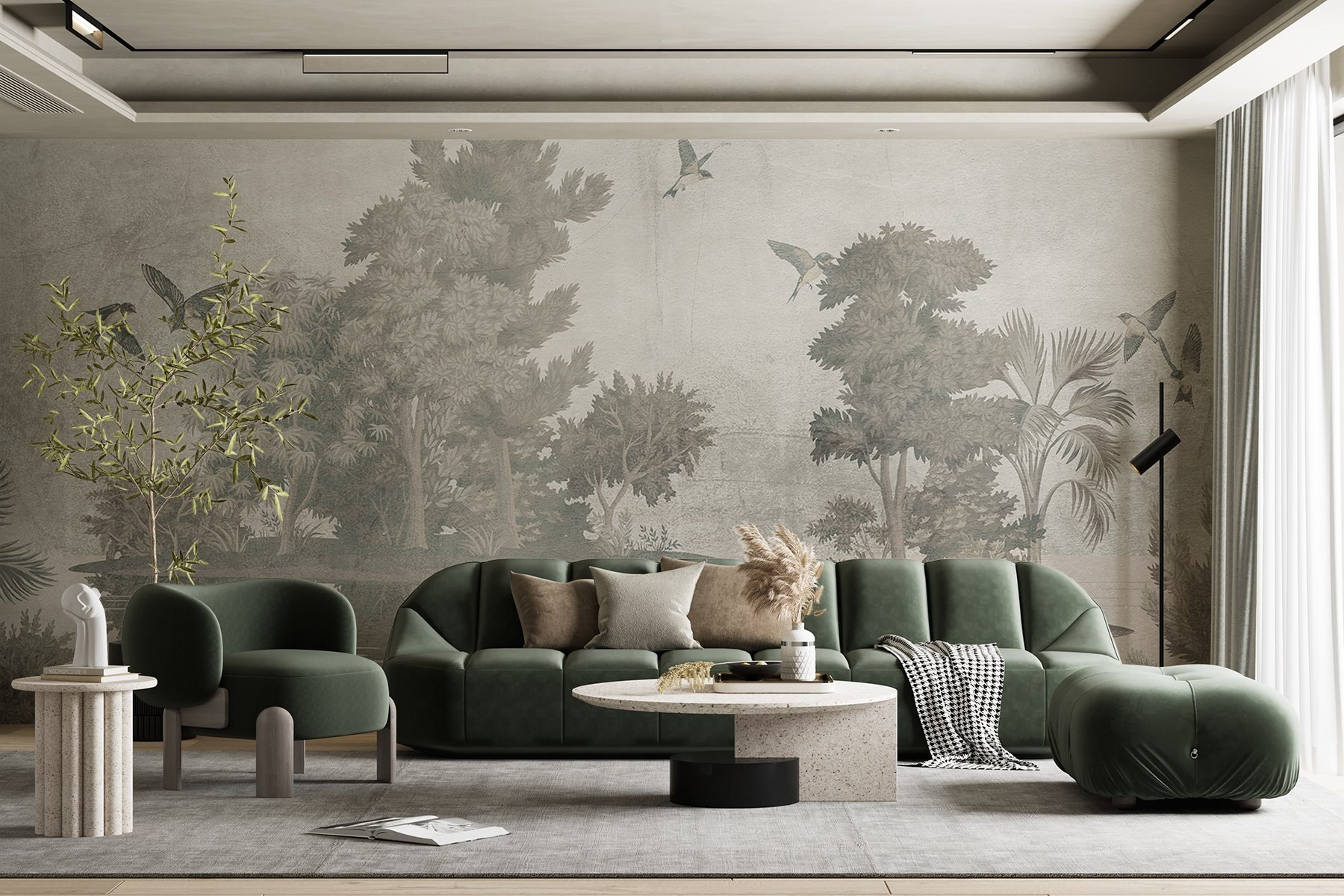 Imagine-se a entrar numa floresta serena onde os pássaros voam sobre árvores suaves – este mural faz exatamente isso! “Pássaros voando sobre árvores” oferece uma fuga relaxante diretamente nas suas paredes. As cores suaves e o trabalho artístico delicado criam uma vibração pacífica, perfeita para transformar qualquer espaço num refúgio para os amantes da natureza. Imagine serões aconchegantes com um bom livro, com os sussurros suaves das árvores à sua volta. É como ter um retiro tranquilo na floresta em sua casa! Além disso, os pássaros voadores parecem quase vivos; quem não gostaria de ter um pouco de magia da natureza em casa? Ideal para salas de estar, quartos ou qualquer recanto que precise de um toque do ar livre. Também é um bom início de conversa – as pessoas vão certamente reparar nesta beleza!