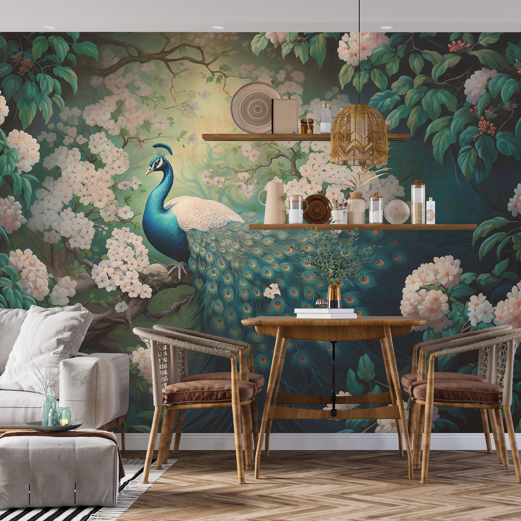 Perfeito para um canto calmo ou mesmo para uma sala de estar animada, este mural combina lindamente com qualquer decoração, criando uma atmosfera serena que faz lembrar um jardim japonês tranquilo. Não é apenas arte; é um início de conversa. Os amigos podem ficar maravilhados com o facto de ter trazido um toque de natureza para dentro de casa. E cada olhar para o seu pavão pode despertar sonhos de viagens tropicais. Imagine um recanto de leitura acolhedor, a brisa a entrar pela janela e esta magnífica criatura a supervisionar tudo. O que há para não adorar?
