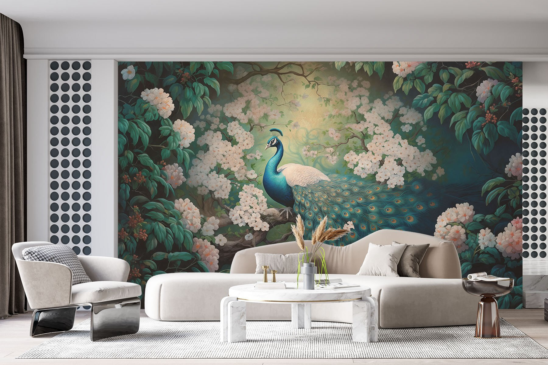 Transforme o seu espaço com este deslumbrante mural de parede com um pavão empoleirado graciosamente num ramo de árvore, rodeado por delicadas flores. É como convidar uma fatia da natureza diretamente para a sua casa! Imagine acordar todas as manhãs com cores tão vibrantes – aqueles azuis e verdes são simplesmente hipnotizantes. Além disso, é capaz de se sentir um pouco elegante tendo um pássaro tão majestoso como companheiro de parede.