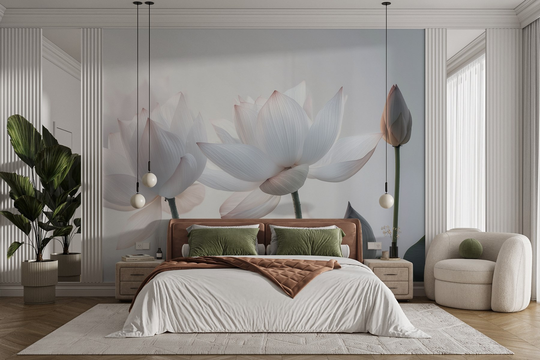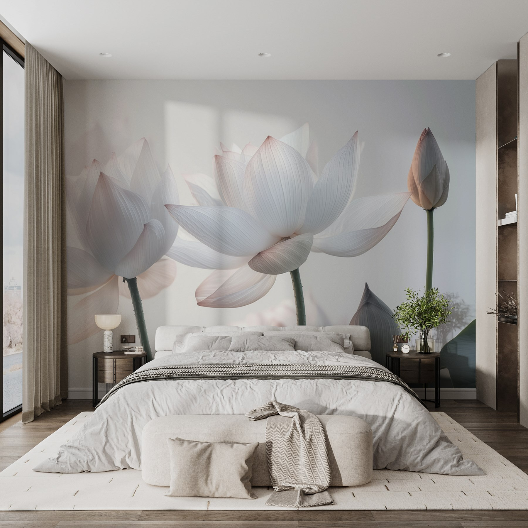 Imagine entrar numa sala que parece ter sido beijada pela primavera, durante todo o ano. Este mural, “Delicate Blooms in Soft Light”, transforma qualquer parede sem graça num jardim de sonho de flores pacíficas. São como pequenos sussurros da natureza, trazendo uma vibração calma que suaviza o espaço.