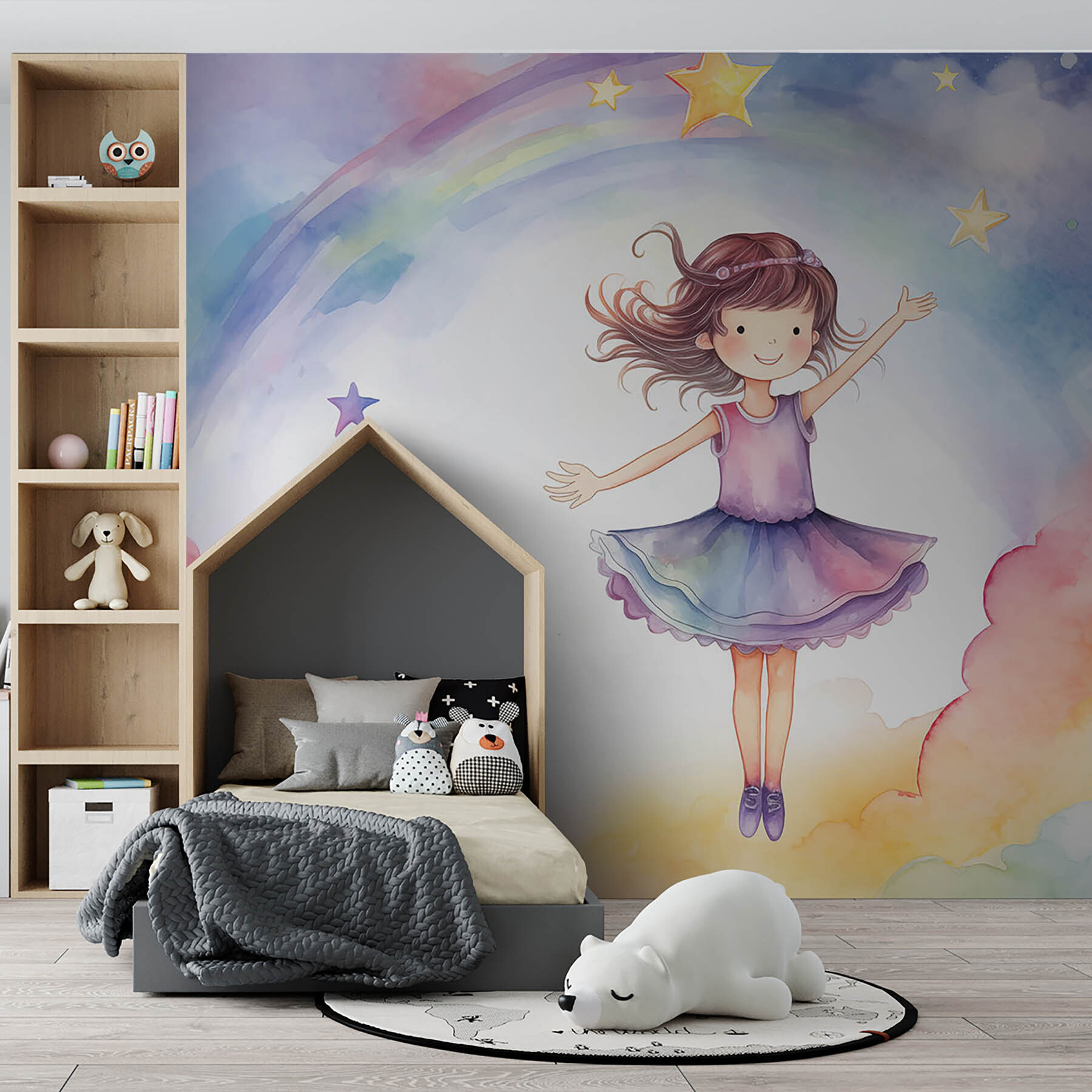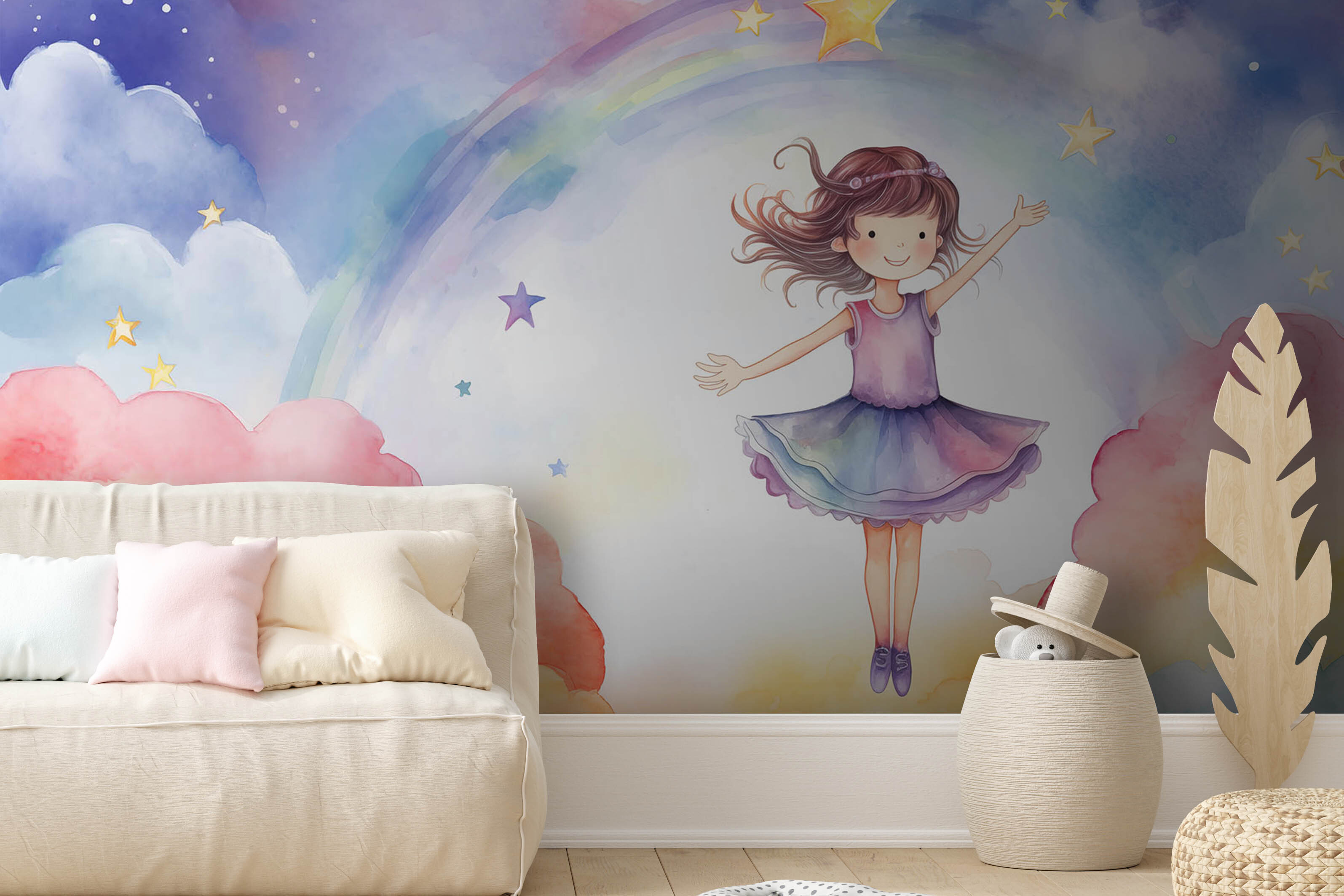 Transforme o espaço de qualquer criança com este mural de parede encantador que apresenta uma rapariga encantadora com um vestido extravagante, dançando entre nuvens e estrelas. As cores pastel suaves criam uma atmosfera de sonho que desperta a imaginação e o espanto – perfeito para um recanto de leitura acolhedor ou um quarto divertido! É como convidar um conto de fadas em miniatura para o quarto. Imagine as gargalhadas e as histórias que se desenrolam em frente a este mural, onde cada olhar pode transportar os mais pequenos para um mundo de aventura. Não é apenas uma decoração; é um convite para sonhar em grande e abraçar a magia da infância!