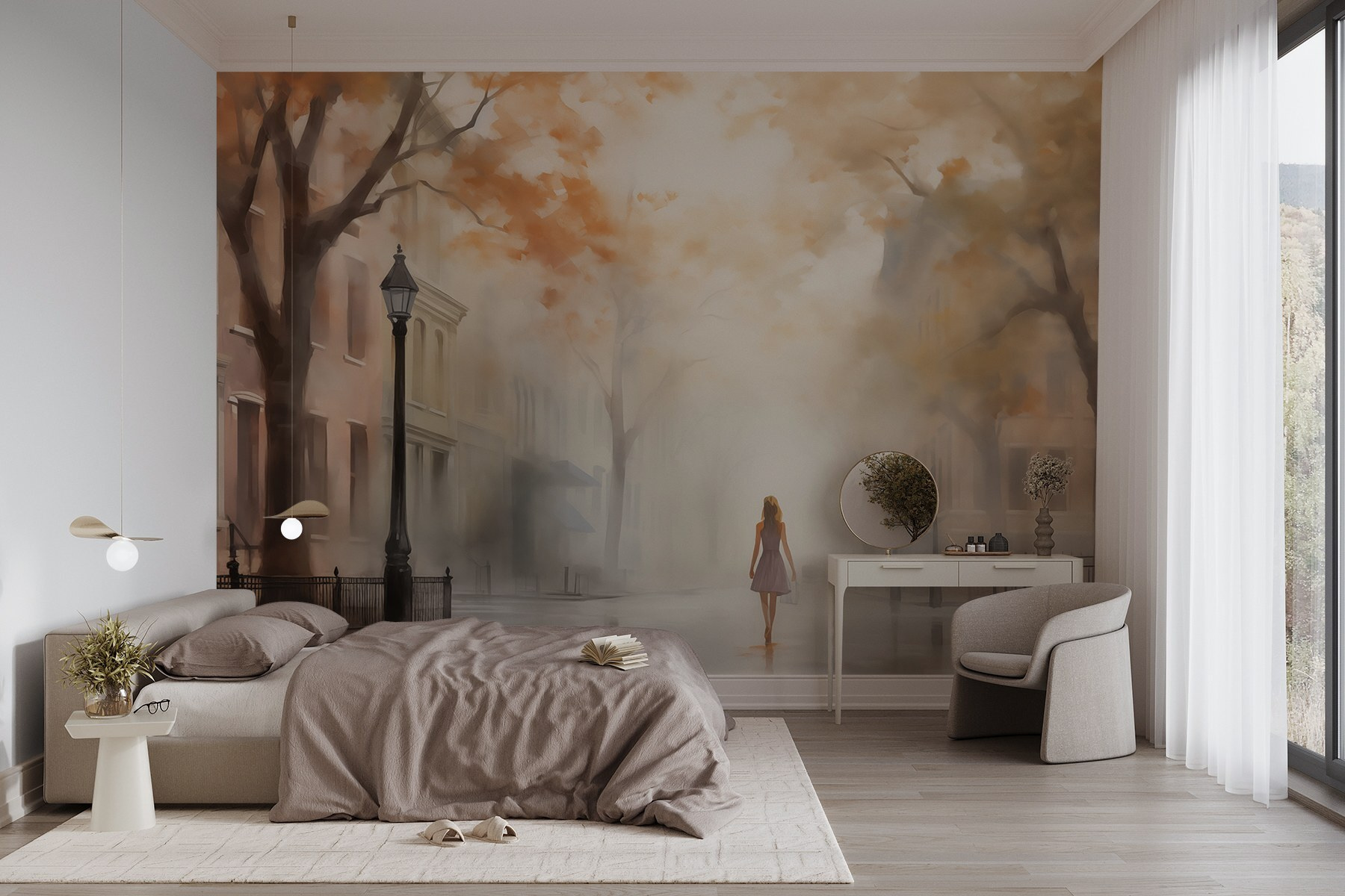 Imagine isto: uma mulher a passear por uma rua enevoada, envolta nos tons quentes do outono. Este mural de parede não é apenas arte; é uma porta de entrada para uma fuga de sonho. Imagine-o a iluminar a sua sala de estar ou o seu quarto acolhedor, atraindo qualquer pessoa que o vislumbre. O nevoeiro cria uma sensação de mistério, fazendo com que cada olhar pareça uma aventura. Para além disso, aquela vibração nostálgica? Perfeita para noites passadas a recordar ou a planear a sua próxima fuga. É como convidar uma fatia serena da vida citadina para a sua casa, um passo de sonho de cada vez – uma vibração e tanto!