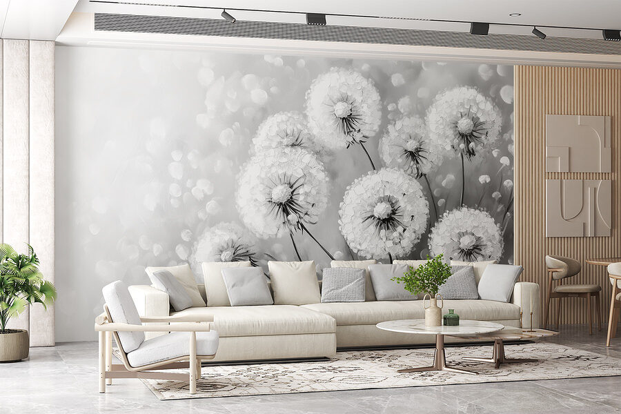 Imagine entrar numa divisão e ser instantaneamente saudado pela elegância arejada dos dentes-de-leão em plena floração – só que, desta vez, estão a preto e branco. Este mural transforma o seu espaço numa fuga sonhadora onde o capricho da natureza se encontra com o estilo moderno. Cada dente-de-leão fofo parece estar pronto a levantar voo, trazendo uma sensação de leveza e alegria. Imagine-se a beber café aqui, perdido em pensamentos, ou a organizar uma conversa em que todos não conseguem deixar de admirar a beleza das paredes. É como ter uma peça de arte intemporal que sussurra histórias de brisas de verão e de dias despreocupados, ao mesmo tempo que acrescenta aquele ambiente tão chique à sua casa. Quer se trate de um recanto acolhedor ou de uma sala de estar animada, este mural tem uma forma de fazer com que os espaços se sintam perfeitos. Perfeito para aqueles que apreciam um toque de natureza sem o alarido – afinal, quem não gosta de um pouco de charme floral?