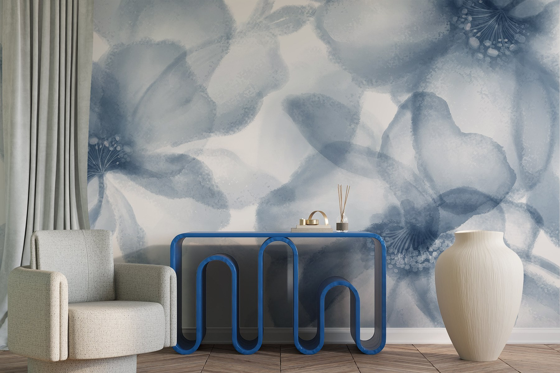 Imagine entrar numa sala e sentir-se como se tivesse entrado num jardim sereno, tudo graças a este deslumbrante mural de parede. Com as suas delicadas flores em aguarela a dançar sobre um fundo branco nítido, é como uma lufada de ar fresco – literalmente! Os tons azuis suaves trazem uma vibração calmante, tornando-o perfeito para uma sala de estar acolhedora ou um retiro tranquilo no quarto. É fácil perder-se nas pétalas de sonho e esquecer o mundo lá fora. Imagine-se a relaxar com um livro, com a luz do sol a entrar e com as flores a empurrá-lo suavemente para o relaxamento. É uma forma simples de transformar qualquer espaço num pequeno oásis de felicidade!
