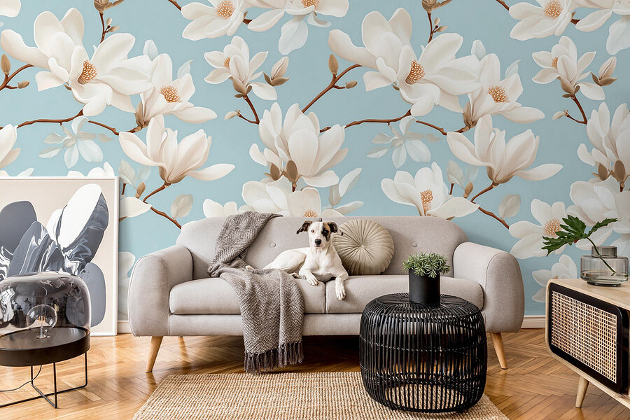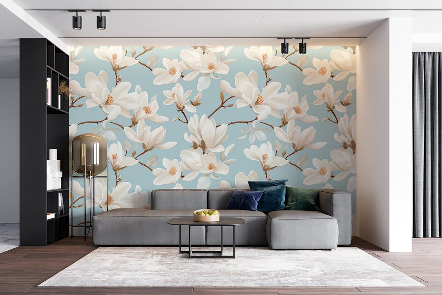 Transforme o seu espaço com o deslumbrante “Padrão de Flores Brancas para Murais de Parede”. Imagine entrar numa sala onde magnólias graciosas florescem contra um fundo azul-celeste relaxante. É como ter a primavera em sua casa durante todo o ano! As pétalas delicadas e as cores suaves criam uma atmosfera relaxante, perfeita para descontrair após um longo dia ou para se aconchegar com um bom livro. Os seus amigos vão entrar e pensar que se escondeu num jardim exuberante! Além disso, é uma lembrança de que a beleza pode estar apenas a uma parede de distância. Quem diria que a decoração da casa poderia ser tão refrescante e alegre?