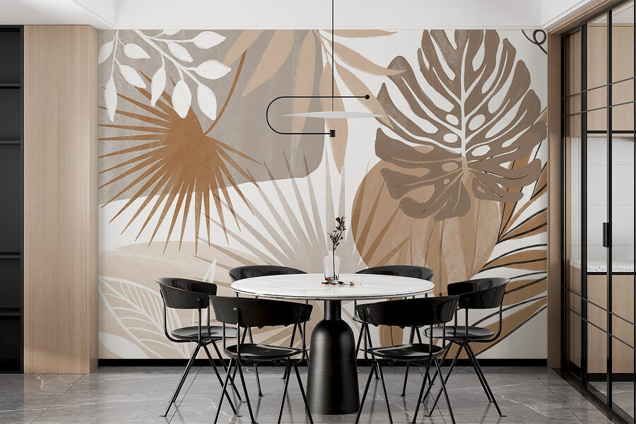 Transforme o seu espaço com este mural de parede cativante, que apresenta um design abstrato inspirado na natureza. Imagine entrar no seu quarto e ser recebido por uma explosão deslumbrante de tons de terra e folhagem graciosa. É como trazer uma fatia de um oásis tropical diretamente para a sua casa.