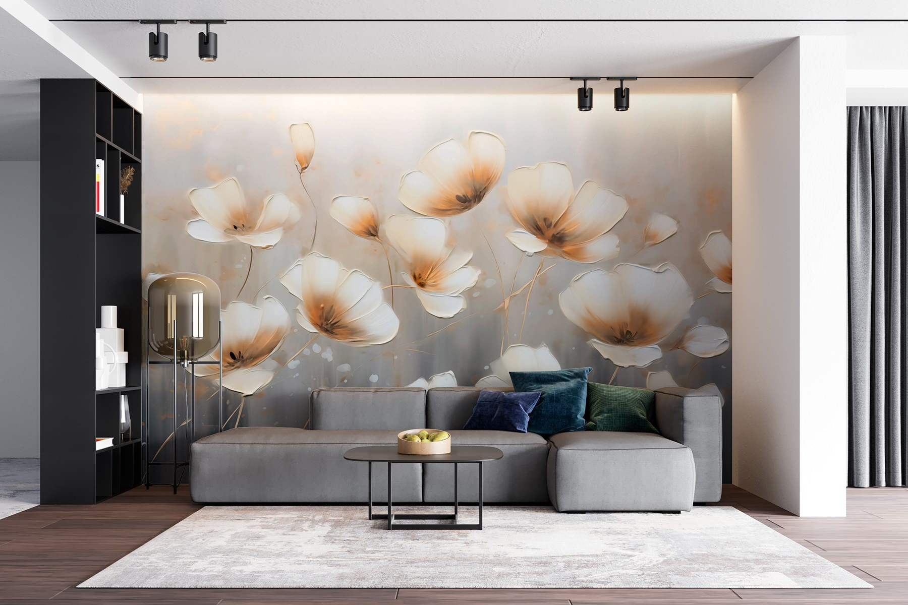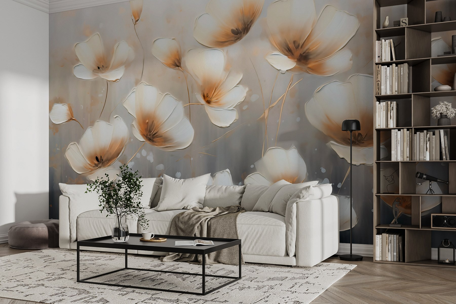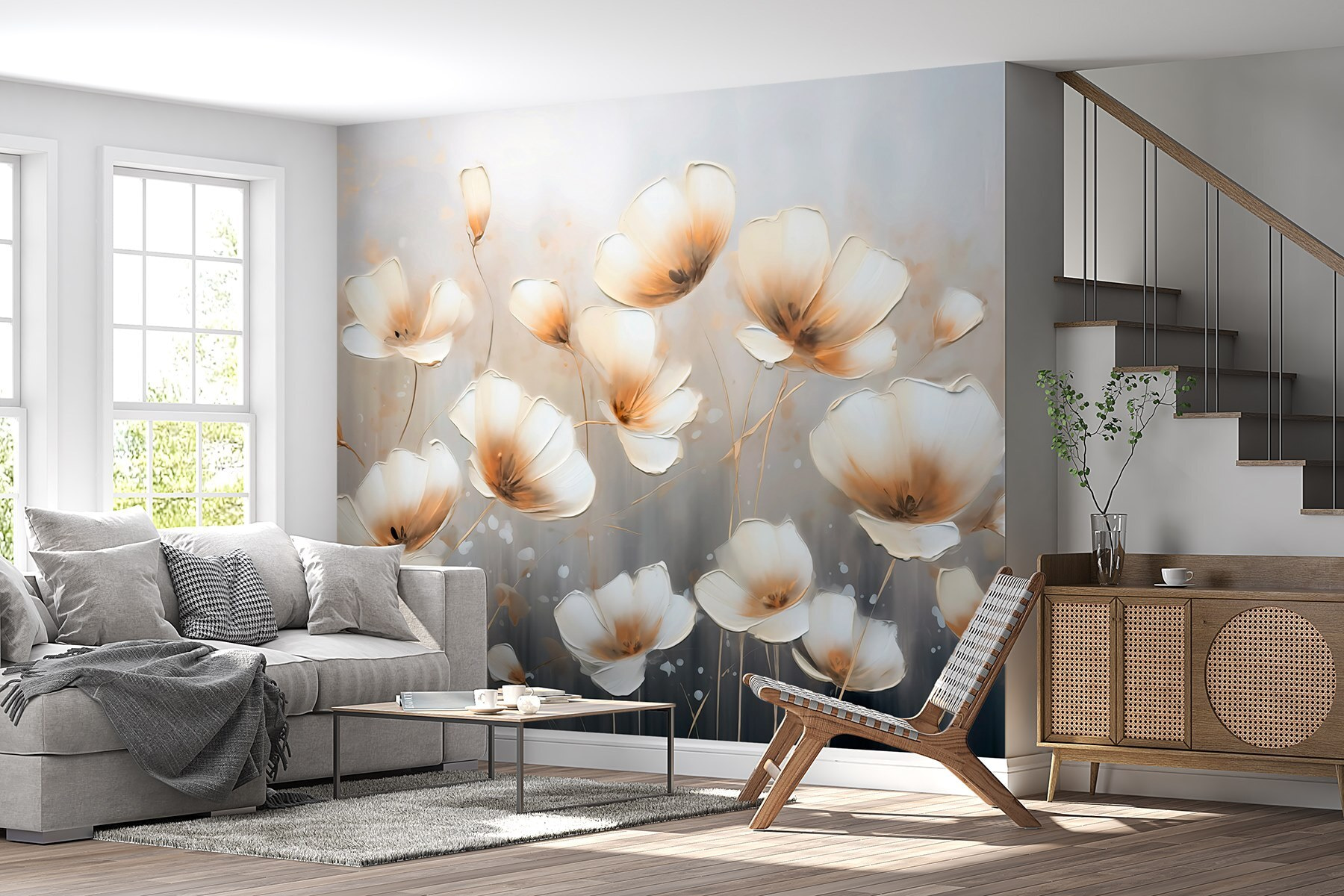 Imagine stepping into a space and being greeted by a stunning wall covered in delicate flowers dancing against a soft grey backdrop. This mural isn’t just decor; it’s a gentle hug for the eyes. Those watercolor blooms seem to sway, whispering stories of spring even on the rainiest days. Picture curling up with a cozy blanket, a cup of tea in hand, feeling transported to a serene garden, where worries seem to drift away. It’s perfect for anyone who wants to add a touch of calm elegance to their home. And let’s be honest—a splash of floral magic never hurt anyone, right? This mural brings life and warmth without screaming for attention, creating a cozy, inviting vibe in any room.