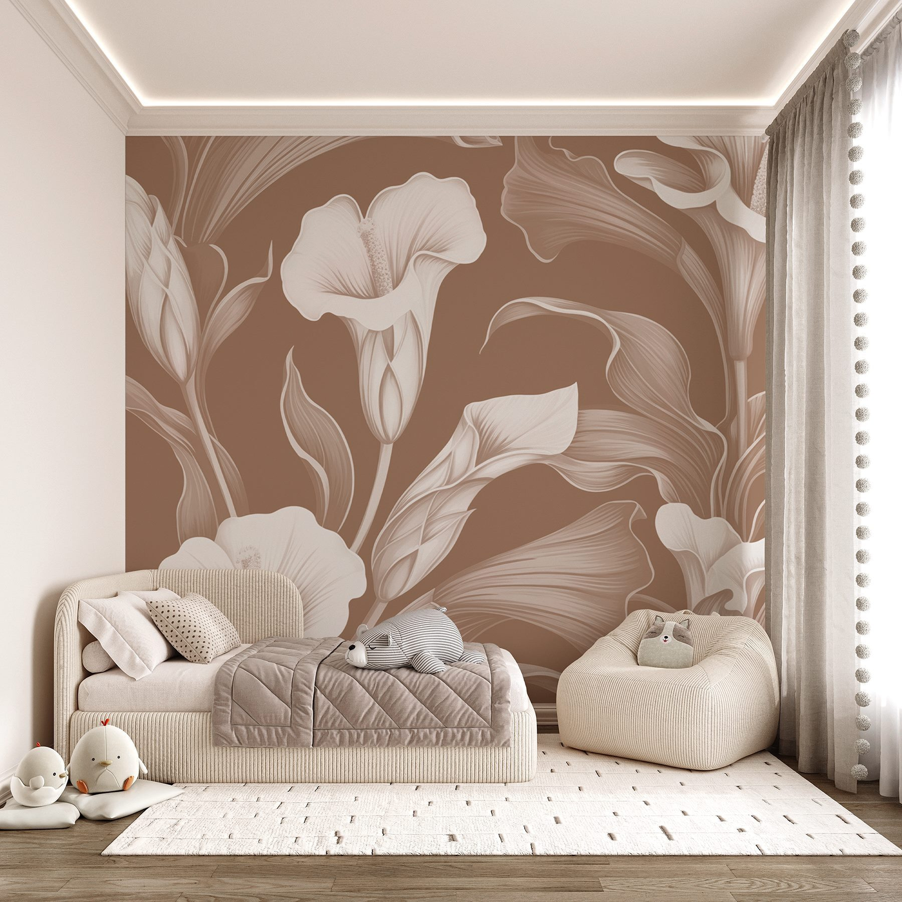 Transforme o seu espaço num refúgio floral sereno com este mural de parede com um elegante desenho floral. Imagine entrar no seu quarto e, de repente, sentir-se num jardim! Os tons suaves e os detalhes delicados criam uma atmosfera tranquila, perfeita para se aconchegar com um bom livro ou desfrutar de uma chávena de chá em silêncio. É como trazer o exterior para dentro de casa, sem as alergias. As flores graciosas dançam pela parede, sussurrando histórias de dias de verão e brisas suaves. Perfeito para qualquer local que precise de um toque do encanto da natureza. Afinal, quem não gostaria de ter um oásis repleto de flores em casa?