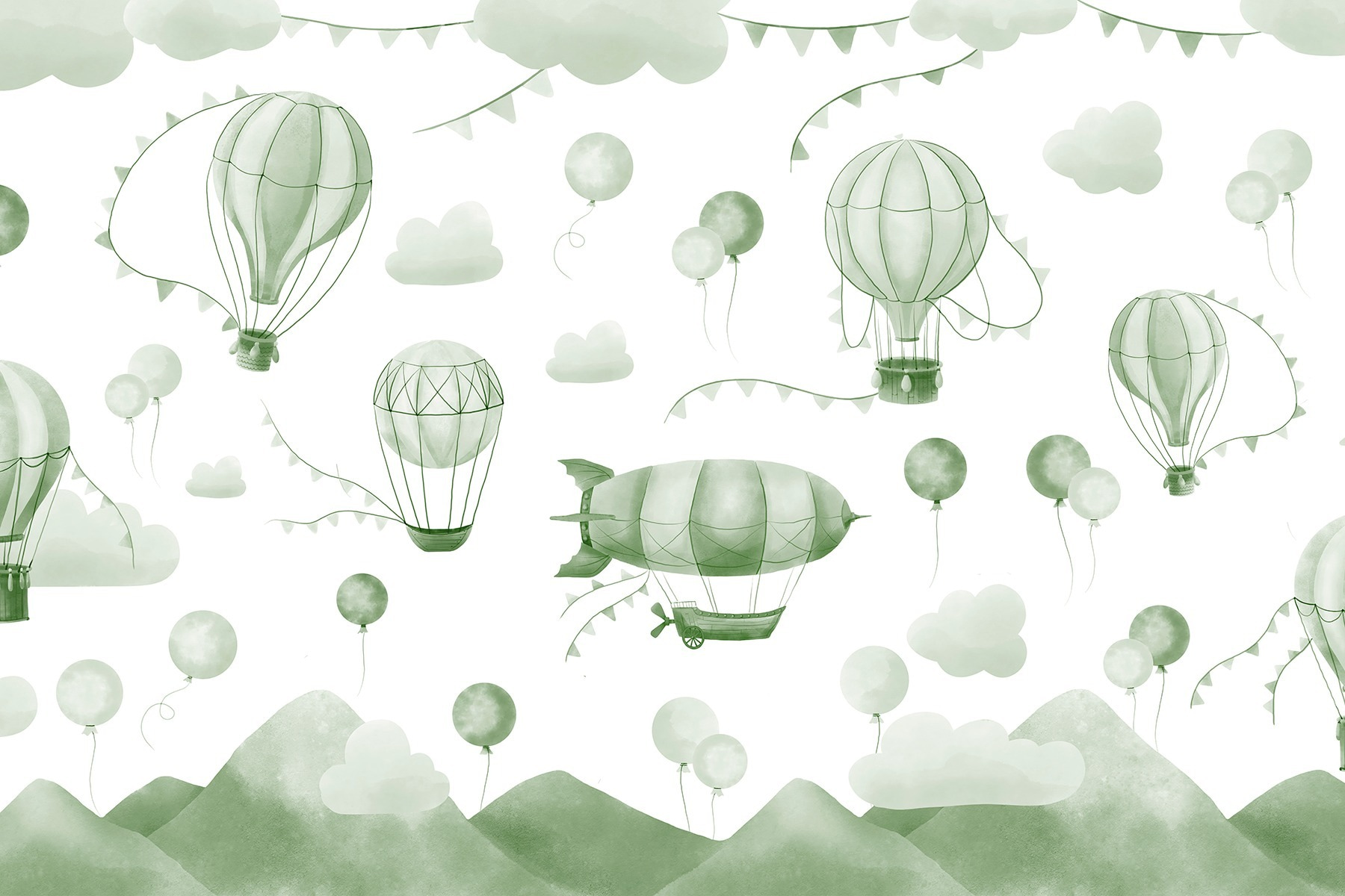 Transforme o seu espaço com este mural de parede encantador que apresenta uma mistura extravagante de balões verdes e silhuetas suaves de montanhas. É como entrar num sonho ou num alegre mundo de desenhos animados onde os balões de ar quente flutuam preguiçosamente no céu, trazendo uma sensação de maravilha e aventura. Imagine um quarto acolhedor iluminado por estes tons suaves – um convite à paz interior e a sonhar acordado. É perfeito para crianças ou para quem tem um coração jovem. Ver estes balões a subir pode despertar alegria e nostalgia, recordando-nos dias de sol cheios de riso e exploração. Este mural pode ser o cenário perfeito para a hora do conto ou apenas para um momento tranquilo a beber chá. Não se trata apenas de decoração; é um pequeno escape feliz!