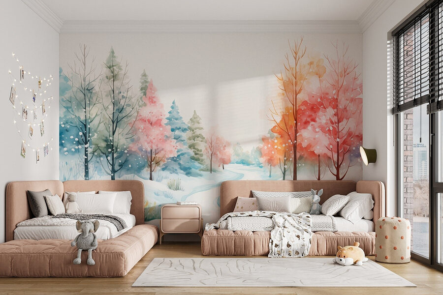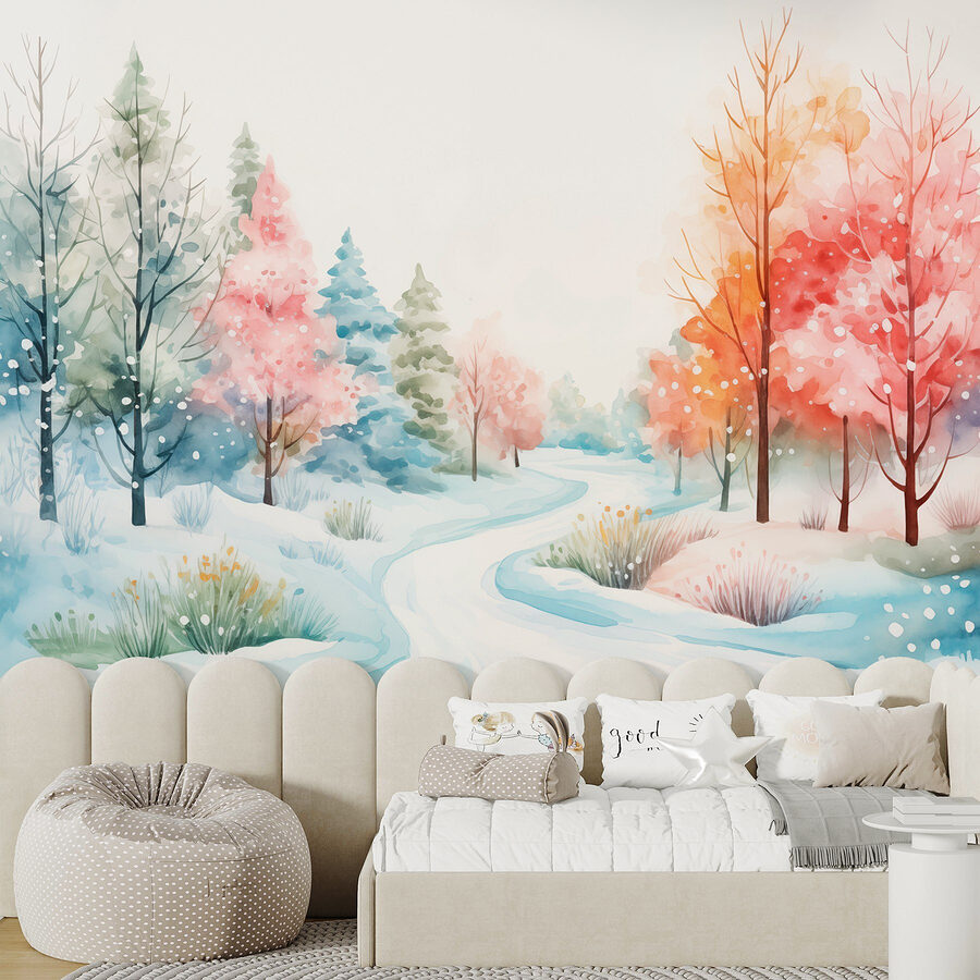 Transforme qualquer espaço com este mural de sonho que apresenta uma cena em aguarela de uma estrada coberta de neve e rodeada de árvores. Imagine o suave estalar da neve debaixo dos pés e o suave farfalhar dos ramos a balançar ao vento. Dá um toque de serenidade e capricho, perfeito para aconchegar uma sala de estar ou iluminar um escritório. As cores divertidas das árvores convidam ao calor mesmo nas manhãs mais frias. É como entrar num país das maravilhas de inverno, sem os dedos dos pés frios e a necessidade de limpar a neve. Então, porque não deixar que as suas paredes contem uma história de calma e beleza?